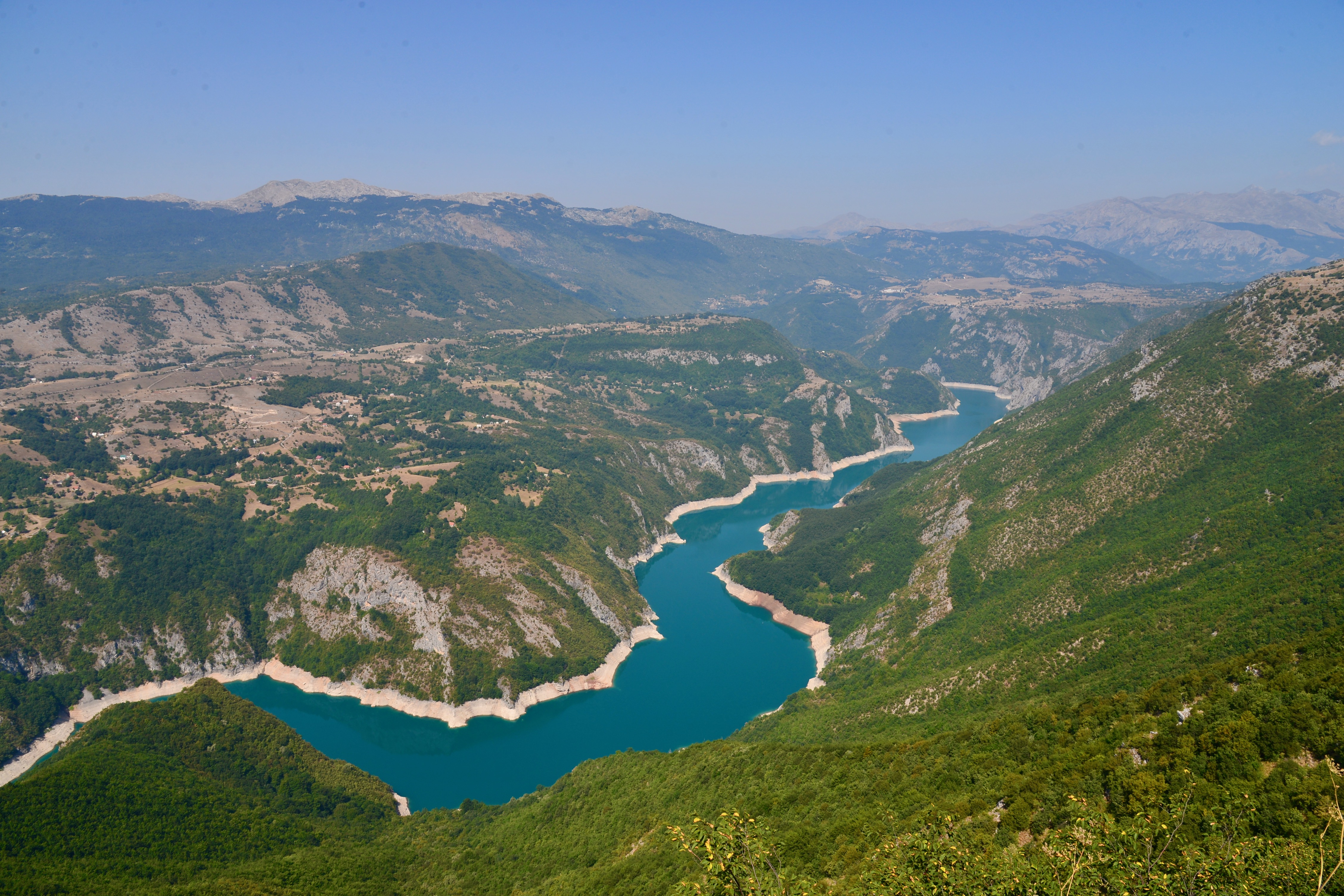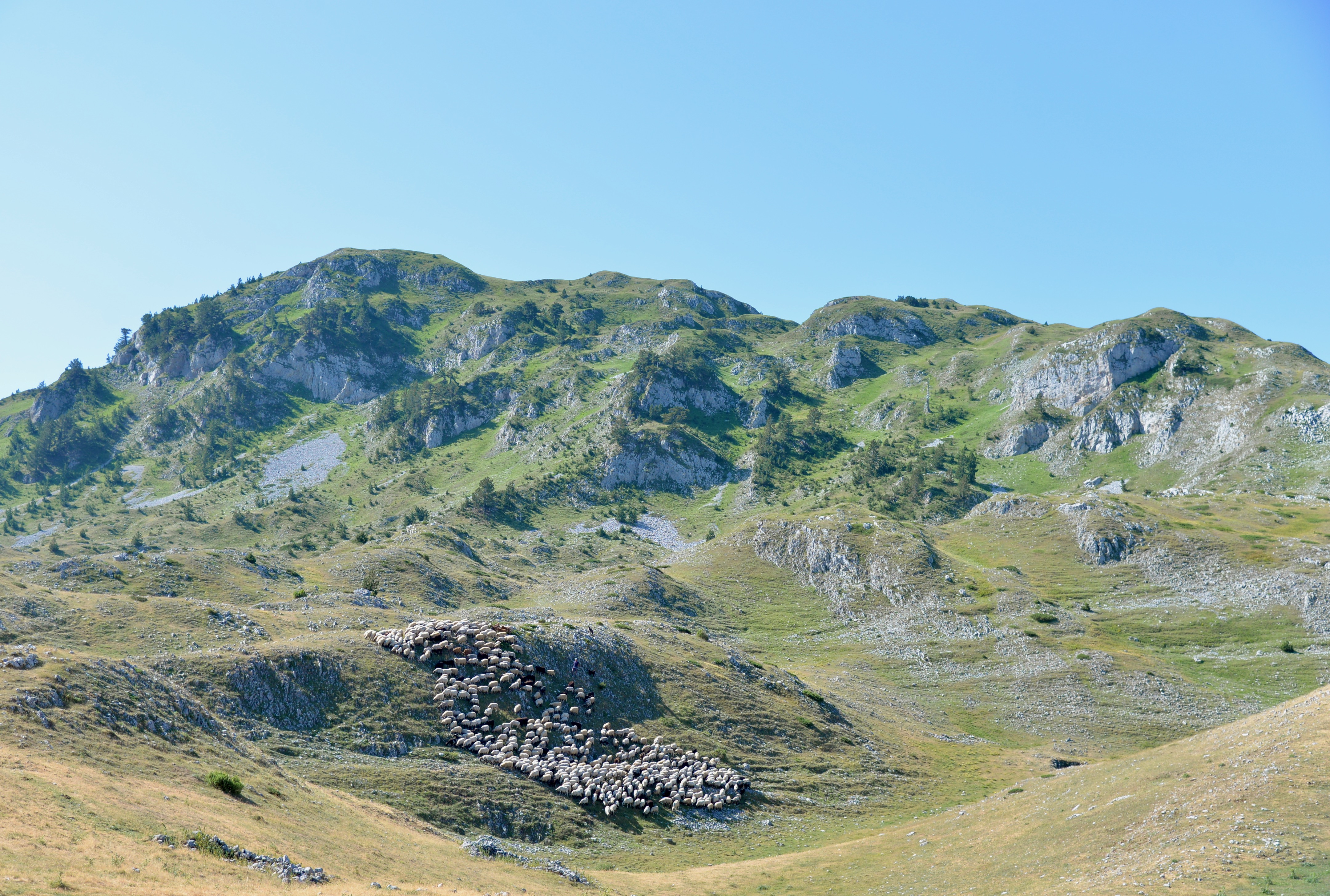 Pfffff, het was warm hier aan Lake Skhodra in Albanie. Zelfs het normaal zo koele briesje in de schaduw was veranderd in een stroom warme lucht die zo uit een föhn leek te komen. Het land, evenals de rest van zuidelijk Europa, wordt geteisterd door bosbranden. Later hoorden en zagen we zelfs dat de meeste branden worden aangestoken om voor vers gras te zorgen voor de kudde’s schapen, geiten of koeien. Maar goed we besloten dus de hoogvlakte van Montenegro in de hoop hier iets verkoeling te vinden. Volgens de geleerden neemt de temperatuur ongeveer af met 6 graden per 1000 meter stijging. Het noordelijke deel van Montenegro waar wij voornamelijk verbleven ligt tussen de 1200 en 1700 meter boven zeeniveau dus het was een aardig aan graadjes koeler. Montenegro wat ” zwarte berg” betekent is niet zo heel groot het oppervlakte is ongeveer 1/3 van Nederland en er wonen iets meer als 600.000 mensen.