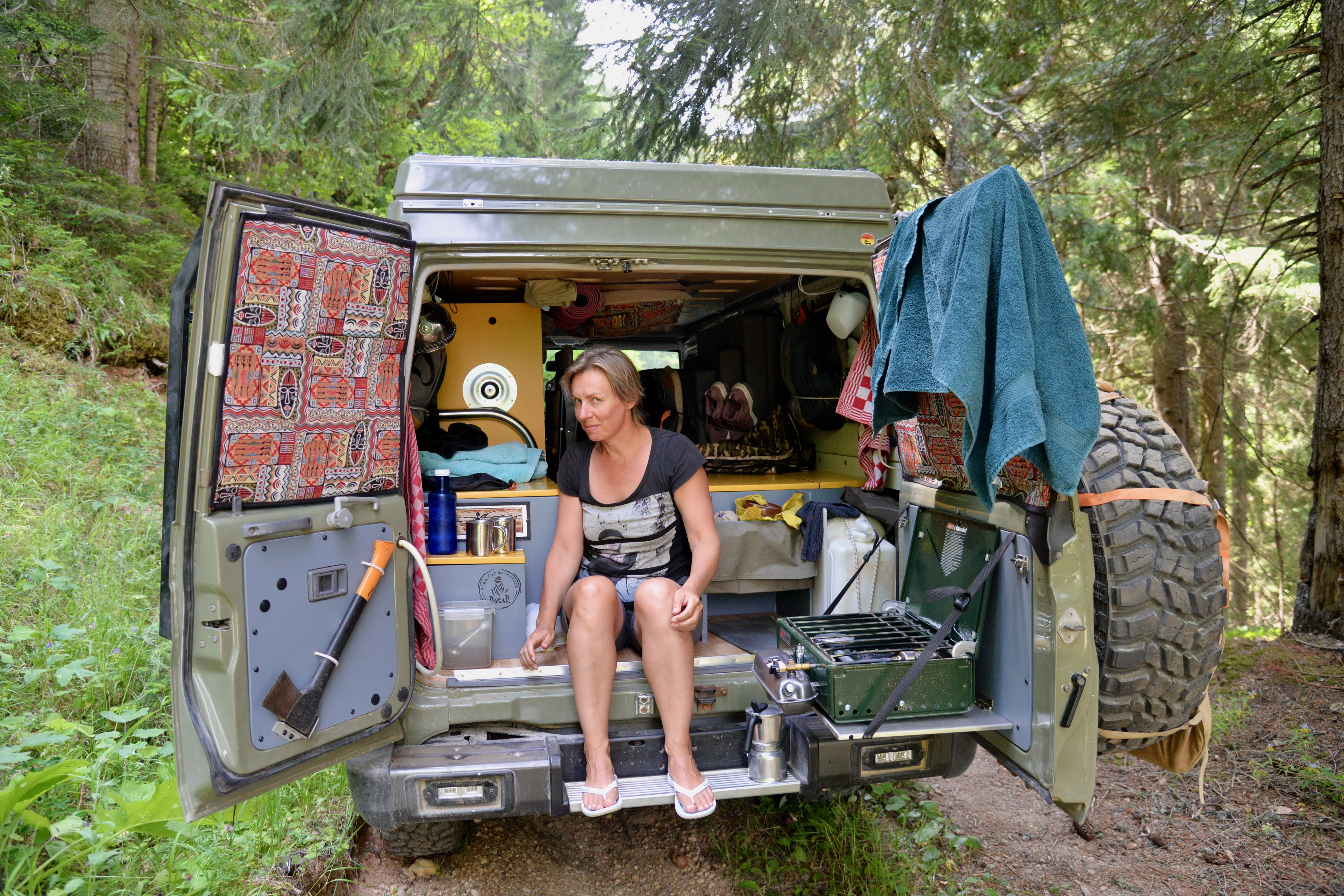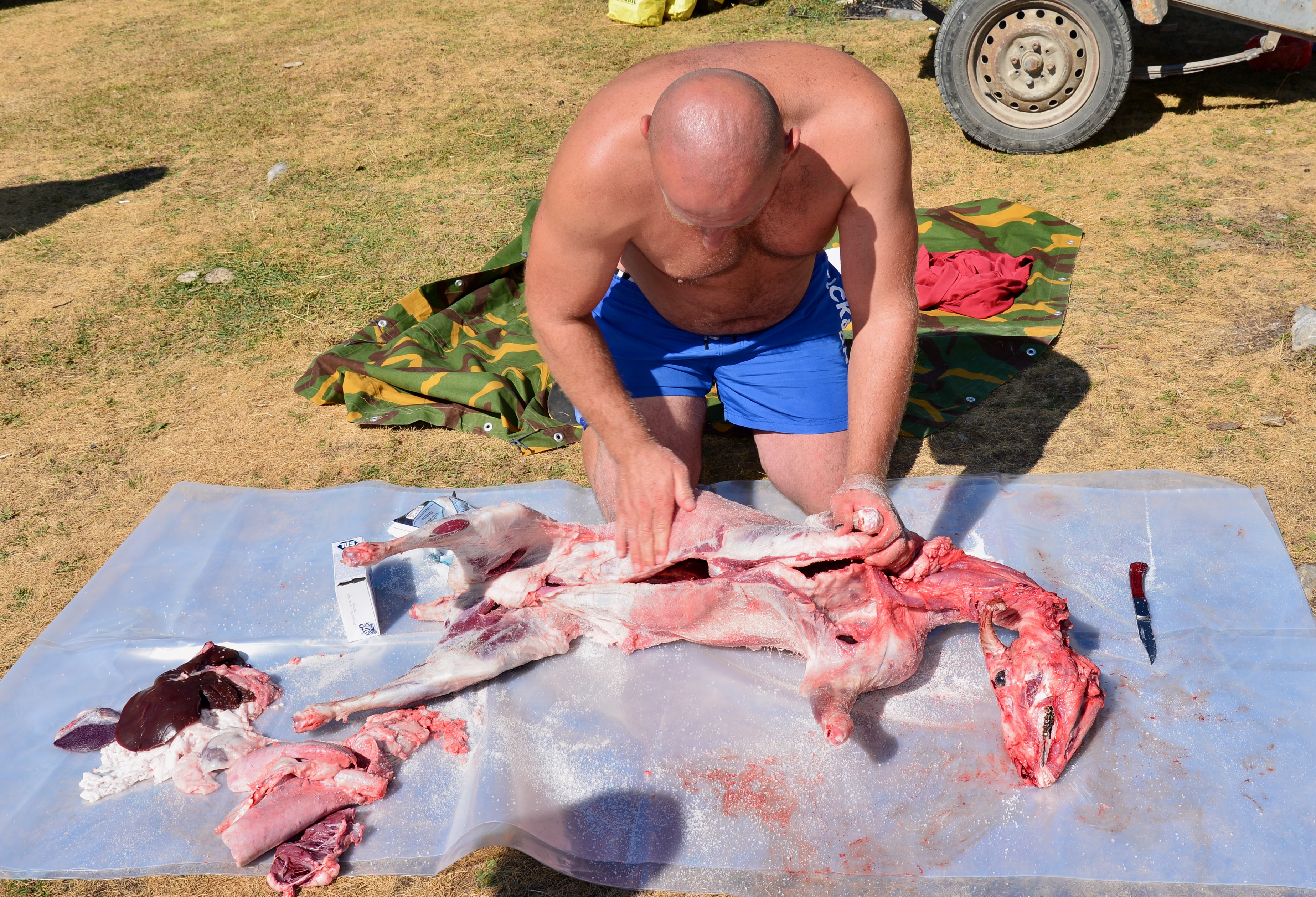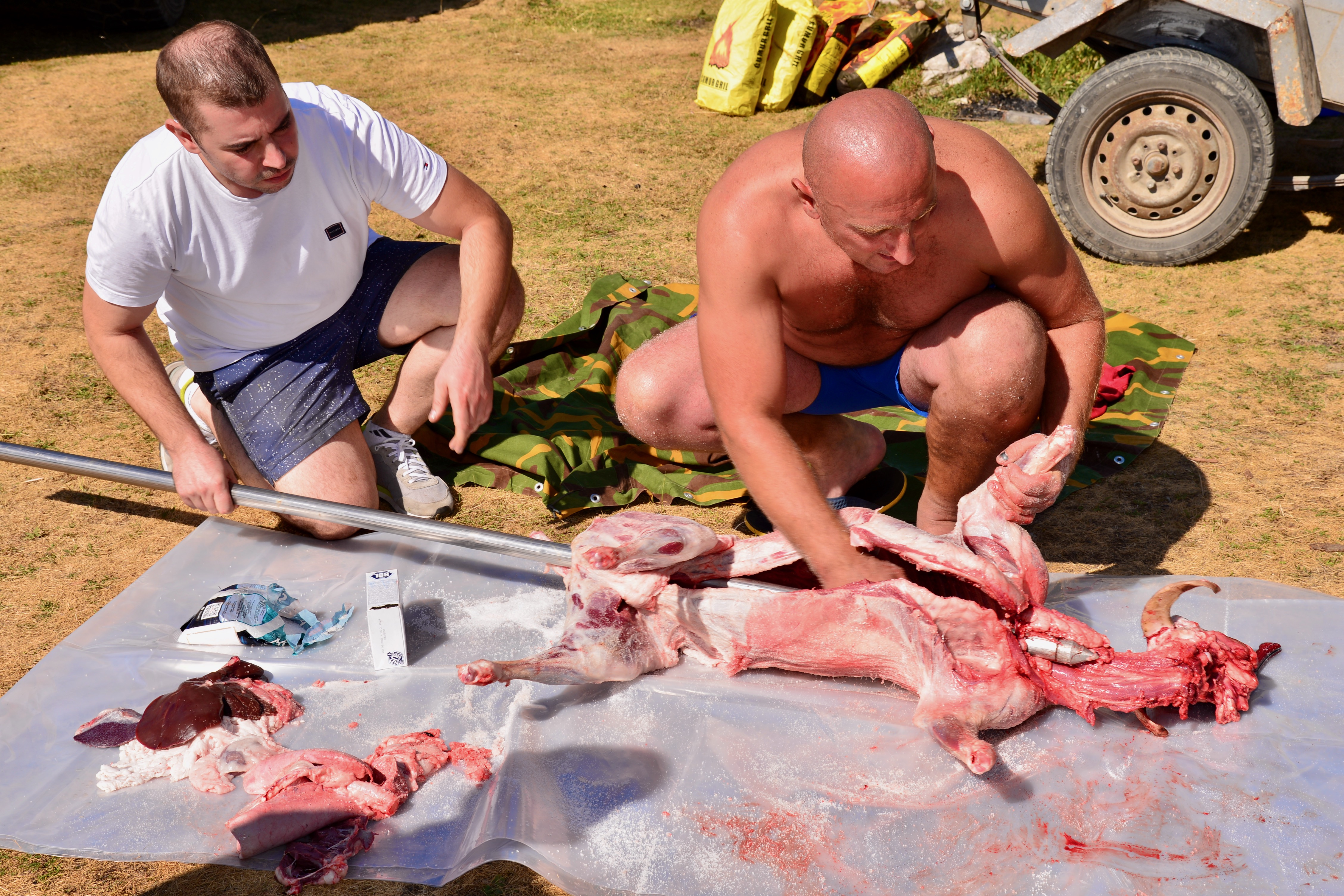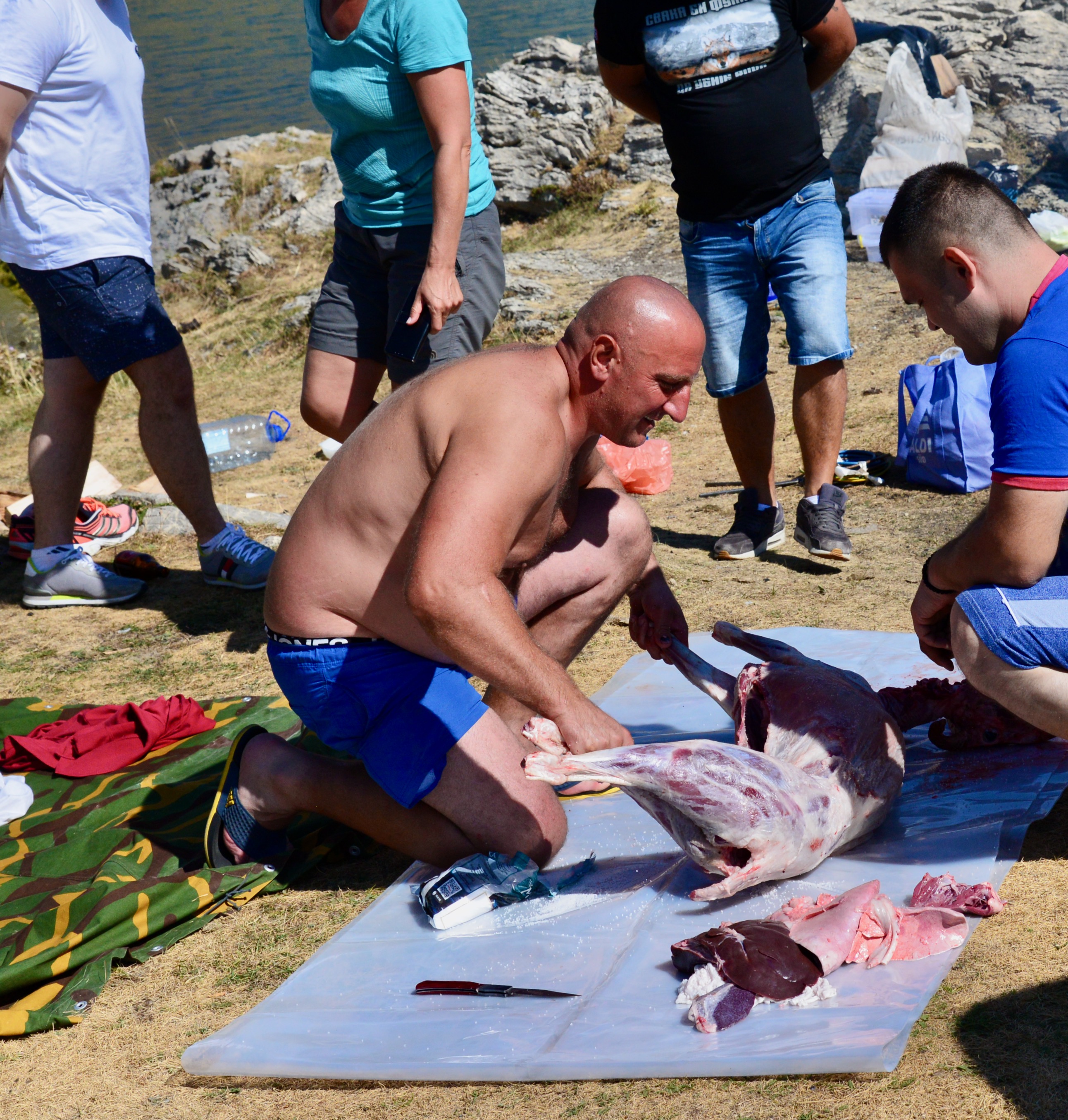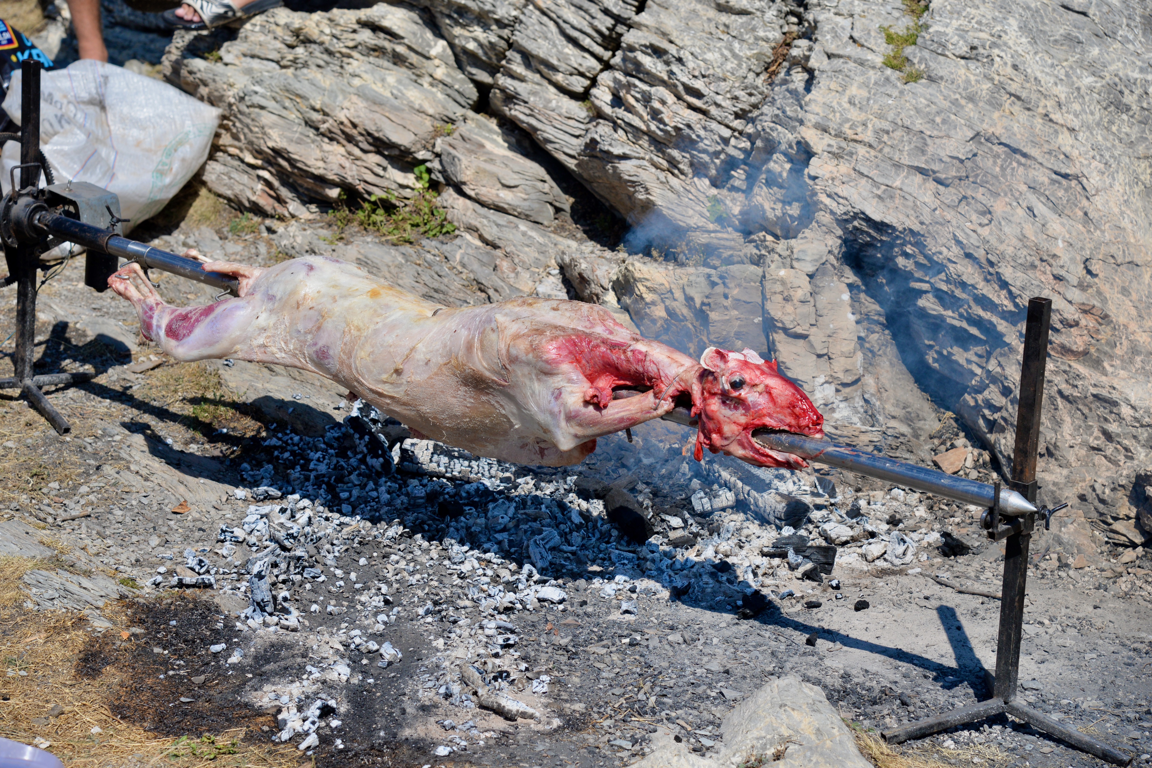 We genoten van het land en kampeerden op de mooiste plekjes, we badderden in rivieren en meren en af toe zochten we een camping op voor een douche om de watertank te vullen en de was te laten doen. We lieten de warme fraaie kust voor wat het was en zochten steeds nieuwe meestal onverharde paden. We waren getuige van “hoe slacht je een schaap” en rijg je hem aan een spit om hem na 4 uren ronddraaien boven het houtskool op te eten. Alle organen en zelf de kop staan hier gewoon op de menukaart en worden gezien als delicatesse… Het hele feest begon trouwens al rond 9 uur in de ochtend en ging al gepaard met de nodige ” pivo’s” (bier). Het was een vriendengroep waarvan de meesten van hen overigens in het buitenland woonden en werkten en eens in de zoveel tijd spraken ze ergens af om een BBQ te houden.