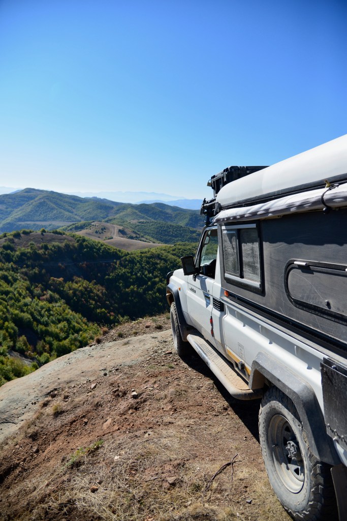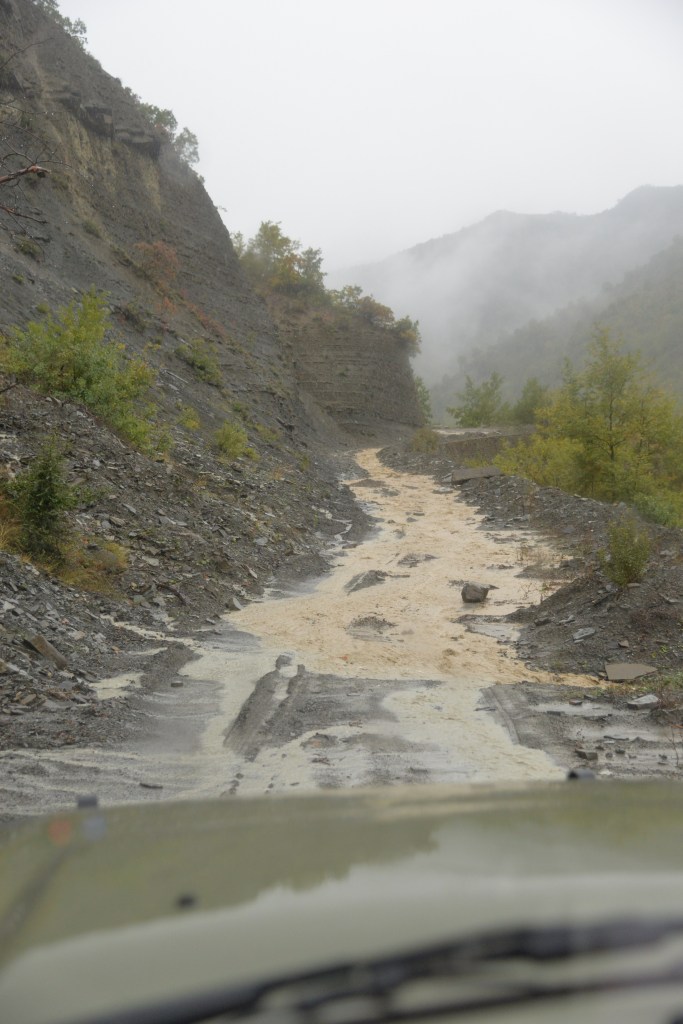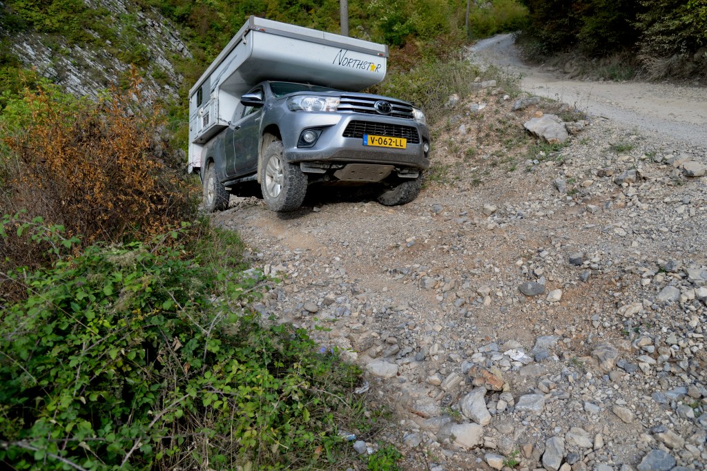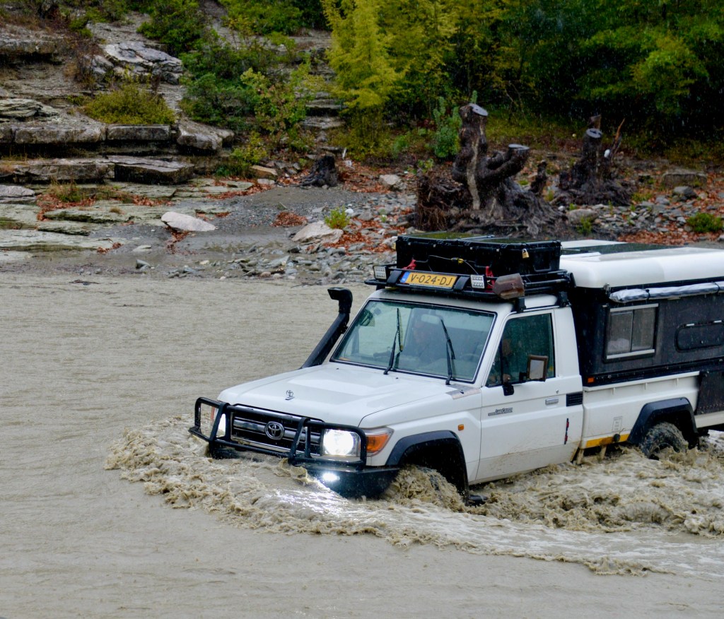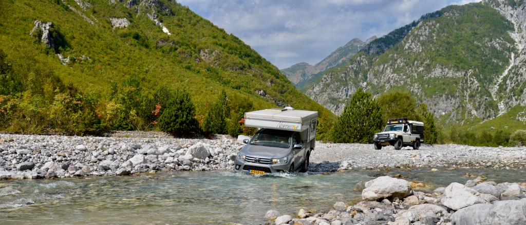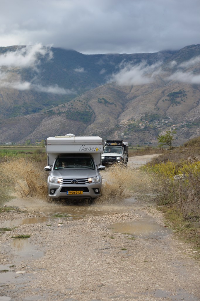 Het weer was fantastisch en op 26-9 reden we richting Theth, het ooit moeilijk bereikbare bergdorp heeft sinds dit jaar een verharde weg gekregen waardoor het niet meer louter voor een 4×4 toegankelijk is. De omgeving was er niet minder mooi door en onze wildkampeerplek geweldig. De volgende dagen werden onverharde routes afgewisseld met asfalt, iets wat geen overbodige luxe was na al dat gehobbel. Wildkampeerplekken met jezelf wassen in de rivier maakten plaats voor campings met warme douche. De tocht met de ferry van Koman naar Fierze ontbrak zeker niet in deze trip en liet het fabelachtige landschap zien vanaf het water. Over water gesproken in week twee van de reis kregen we zoveel water dat de paden veranderden in kleine rivieren, het was fascinerend om te zien hoe een rustig kabbelend beekje veranderde in een kolkende rivier. Het maakte sommige doorwadingen extra spannend.