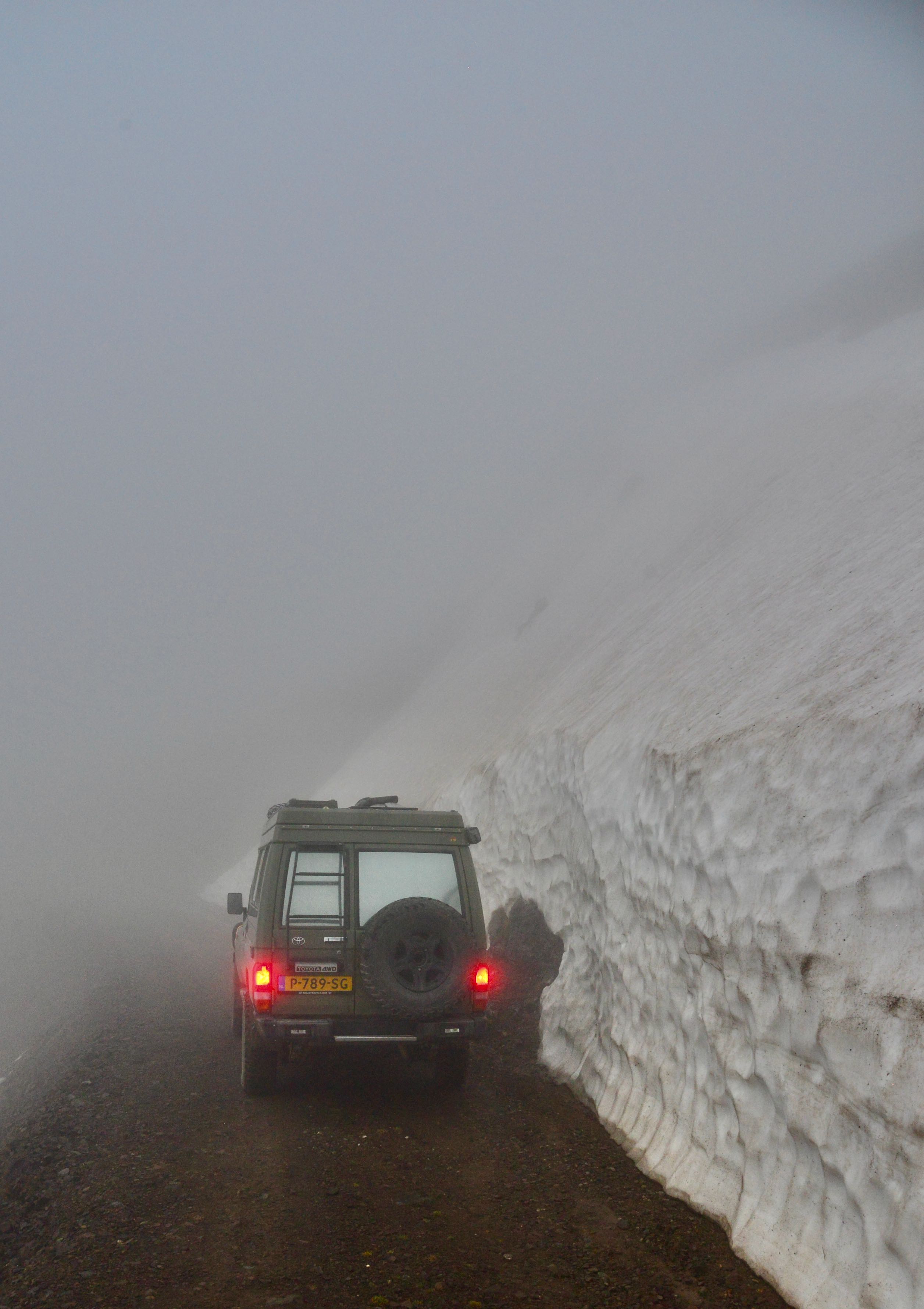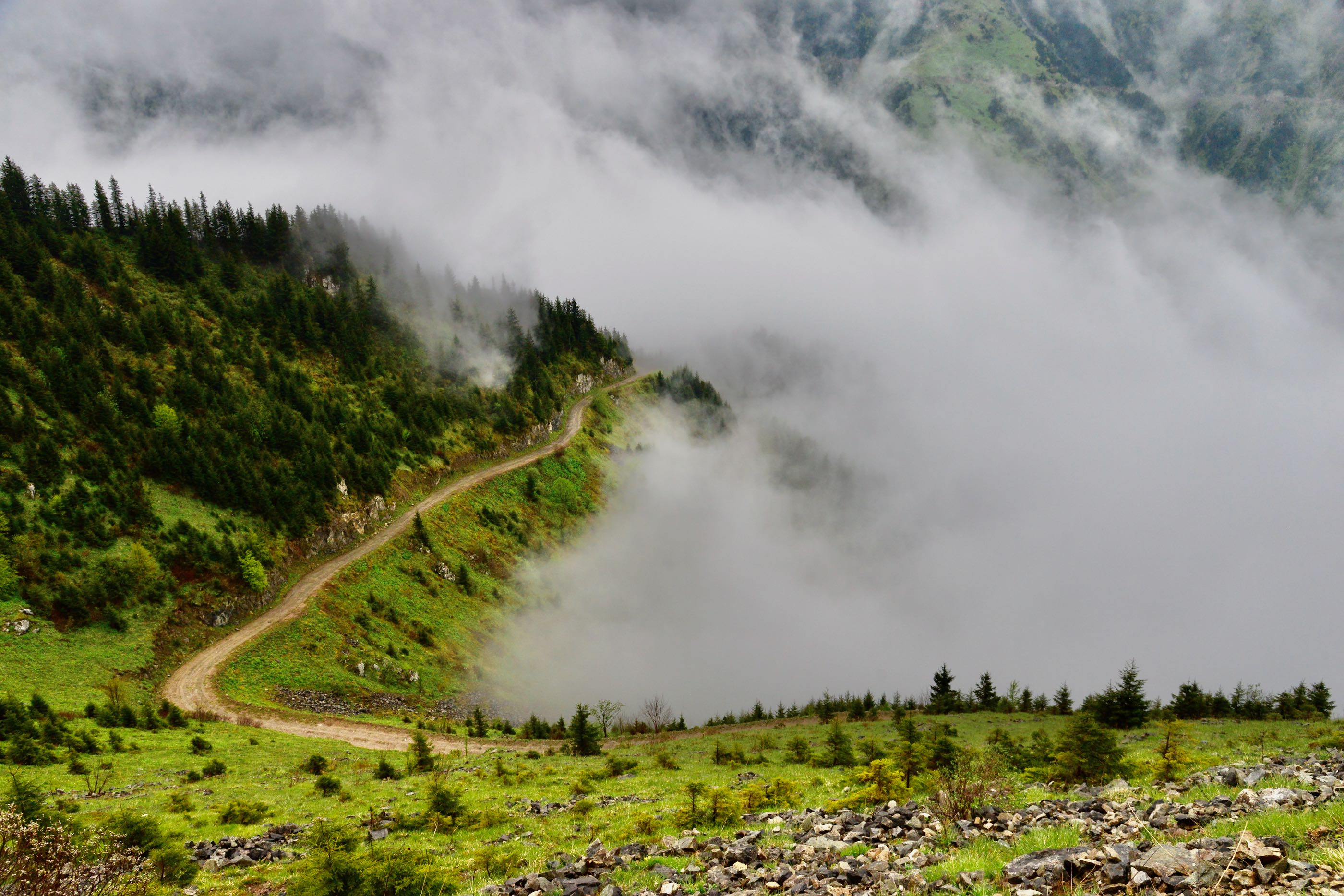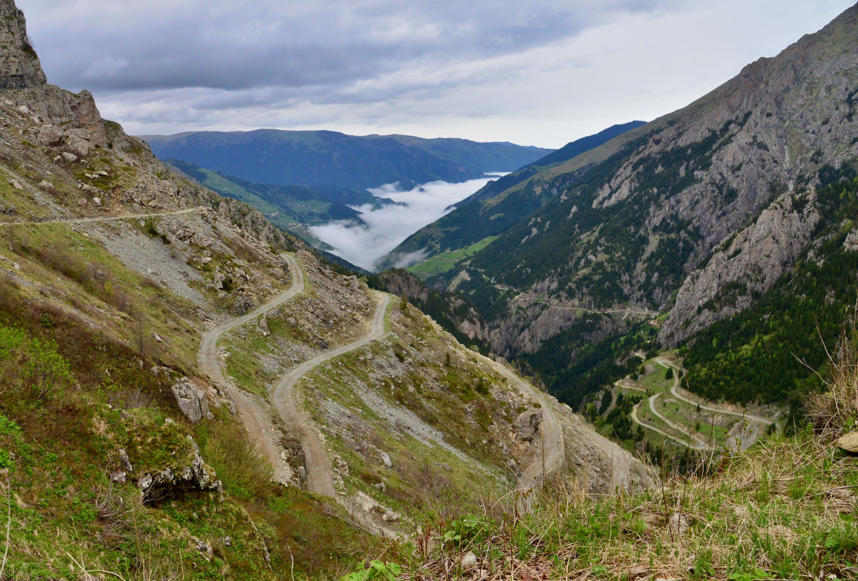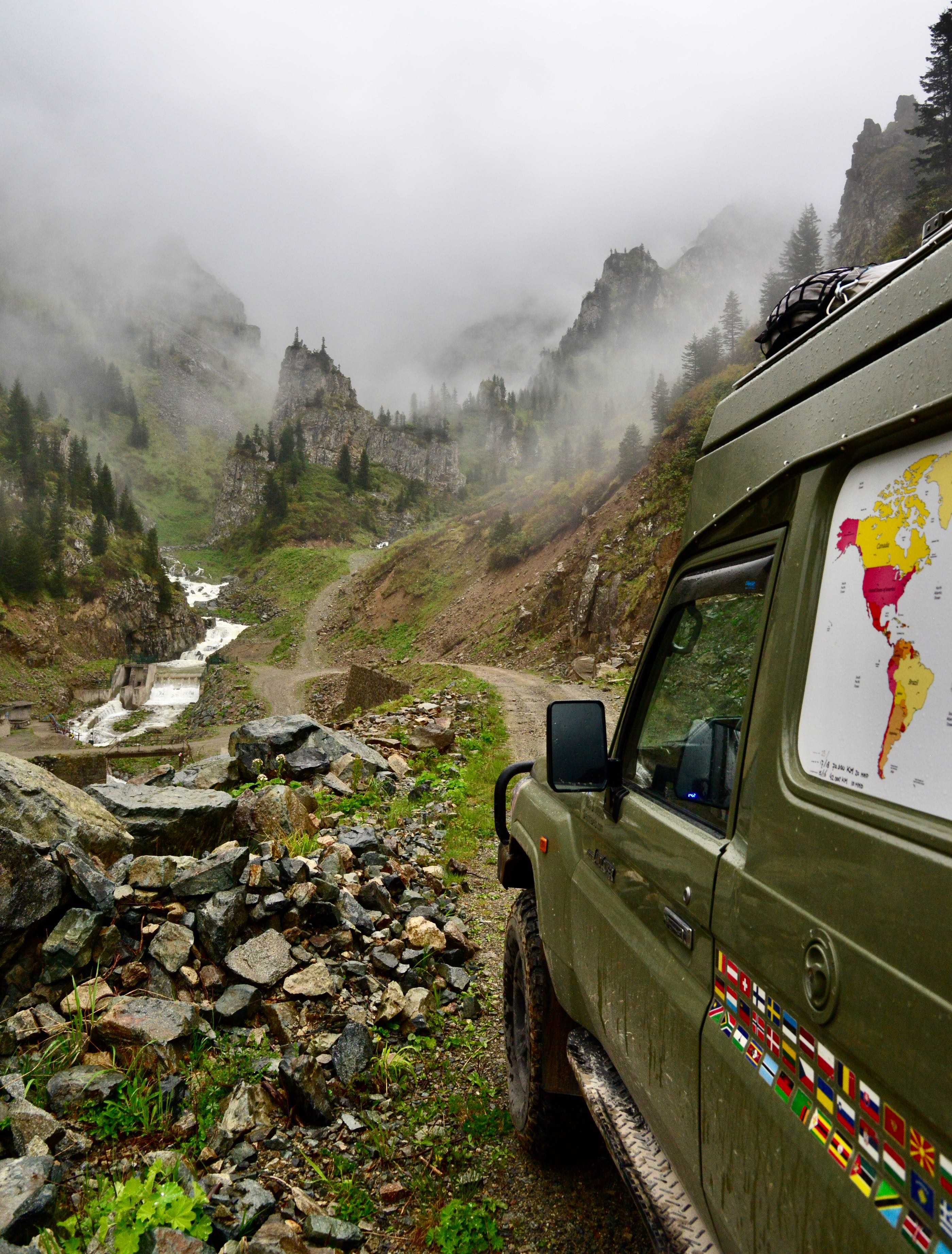 Het is mooi weer en vanaf Bayburt is het een kilometer of 40 tot aan de top. Het waait hier nogal en er ligt ook nog behoorlijk sneeuw op sommige plekken, we zien wel dat de weg is vrijgemaakt dus de weg zal wel open zijn. Terwijl we afdalen wordt het zicht steeds slechter en uiteindelijk belanden we gewoon in de wolken oftewel “ mist “ we zien nog net genoeg om de weg van het ravijn te onderscheiden. Omdraaien is geen optie daar is de weg veel te smal voor, zelfs in de bochten is geen ruimte en langzaam tokkelen we verder in de 1 laag naar beneden. In de meeste van de haarspeldbochten moet ik steken want om de draai in één keer te halen is de weg veel te smal. Voordeel van de mist is wel dat je de steile afgronden ook niet ziet… Uiteindelijk na de vele bochten wordt het zicht beter en zijn we onderaan in de vallei waar diverse watervallen zich met donderend geweld naar beneden storten. Geen goede optie om te kamperen dus rijden we nog maar een stukje door.