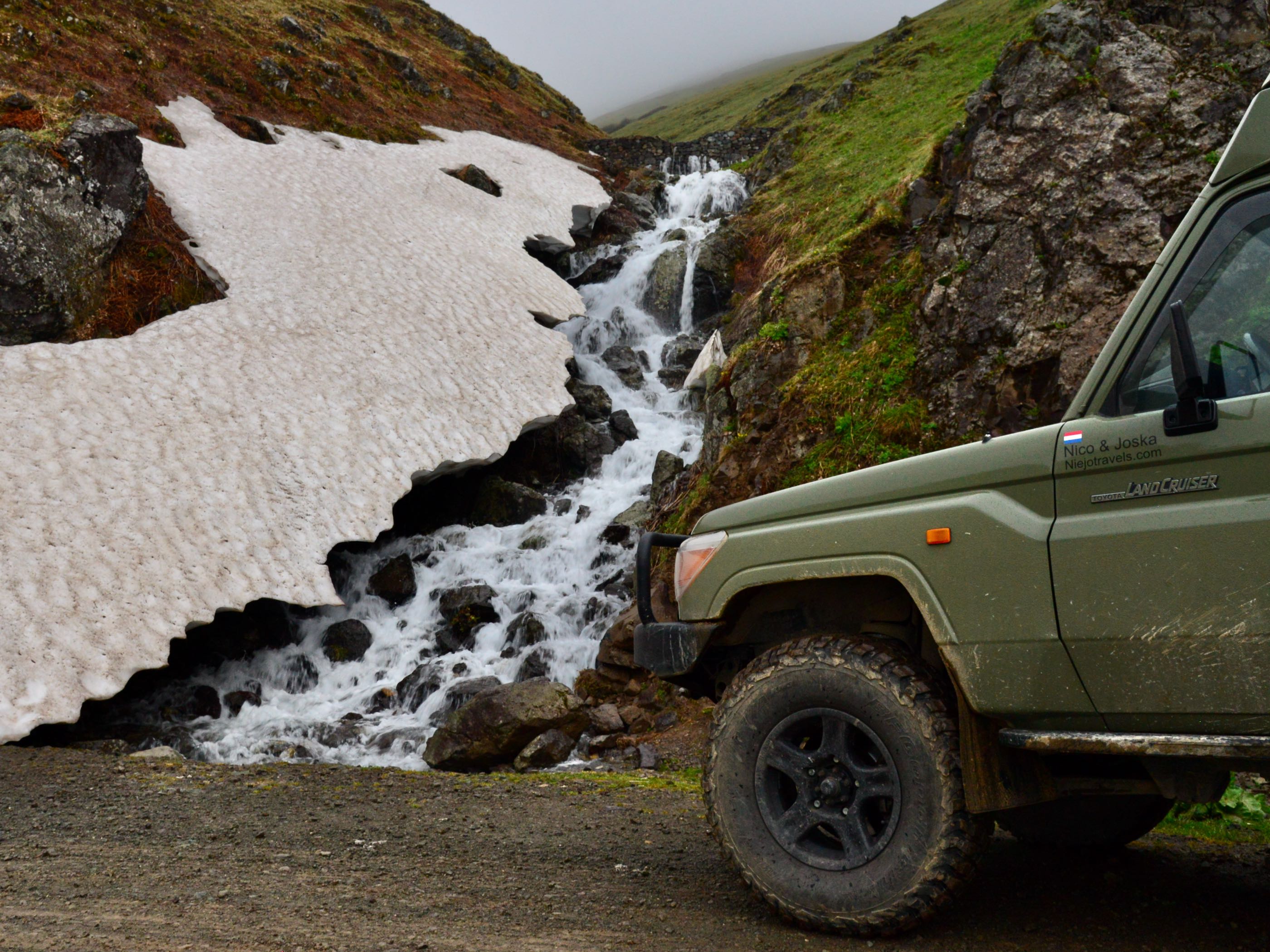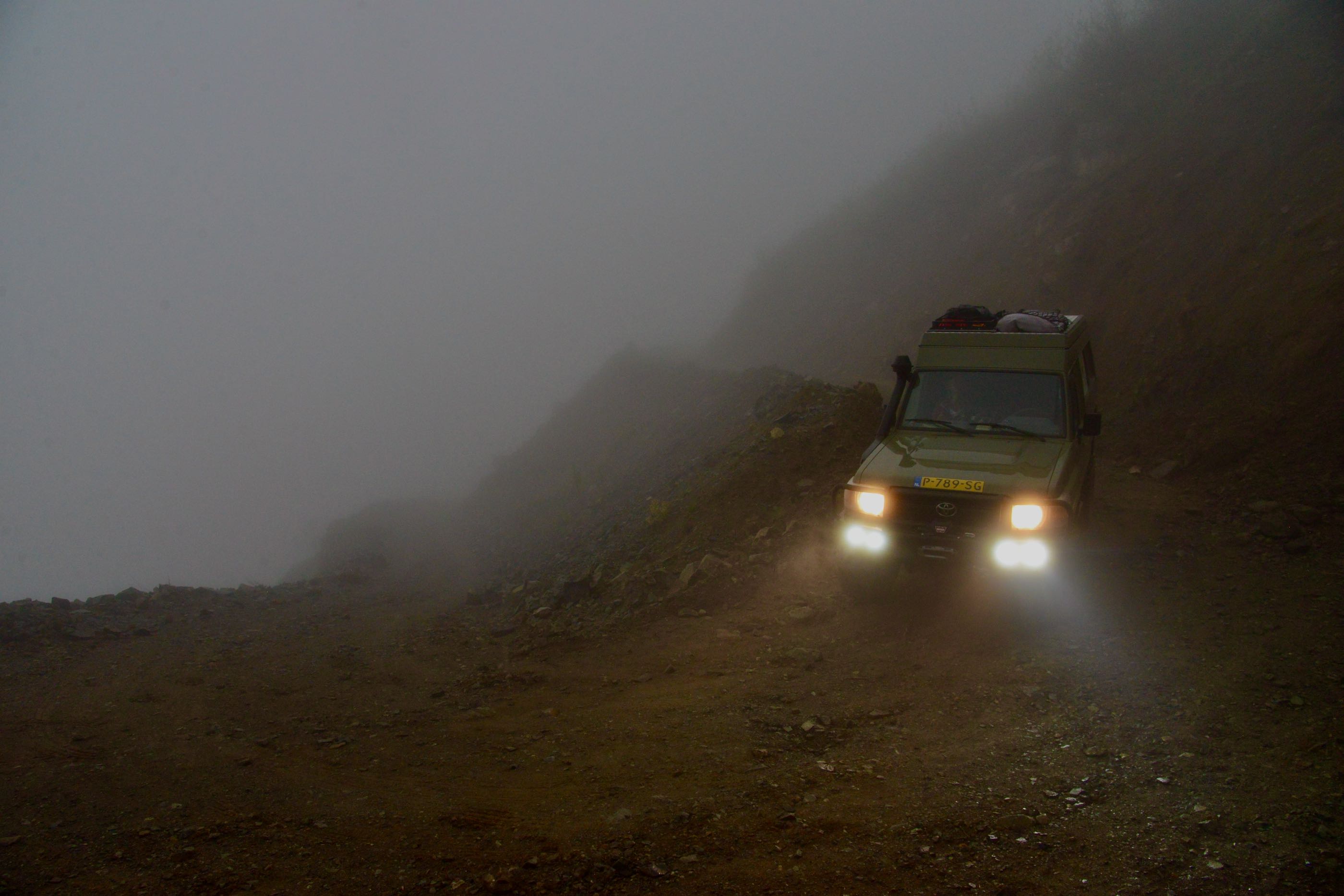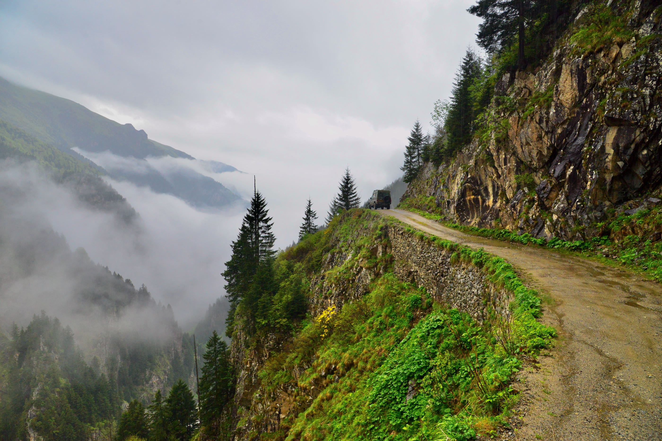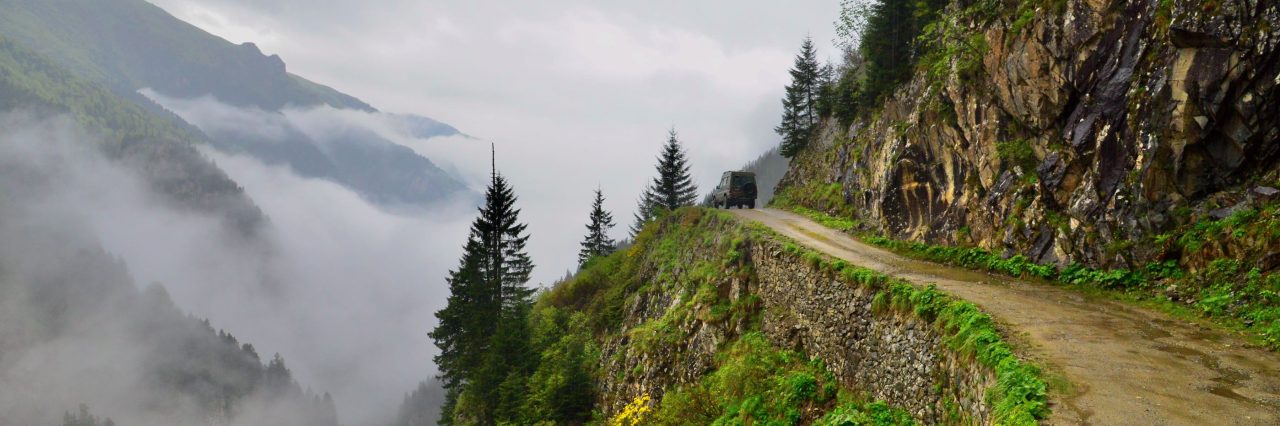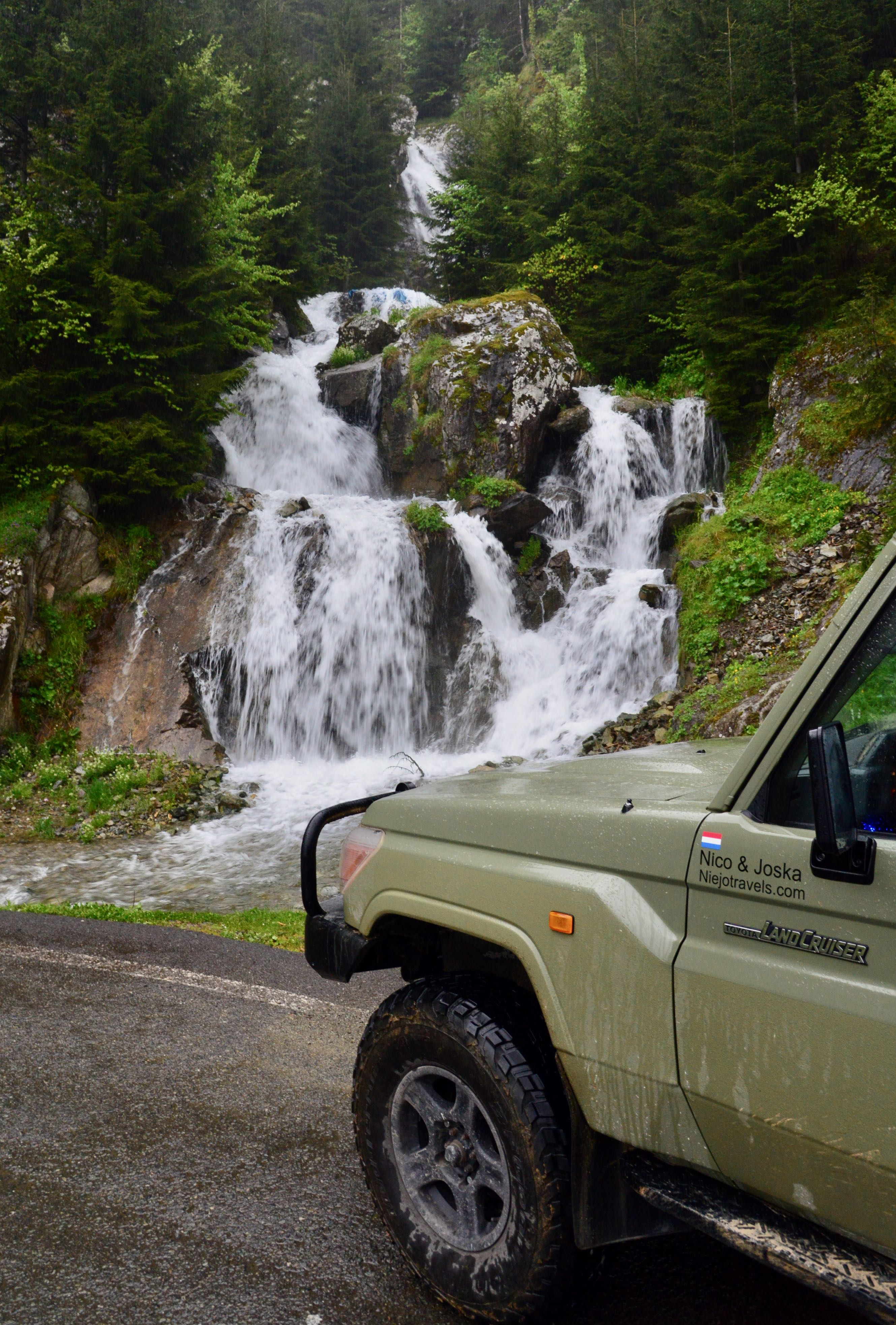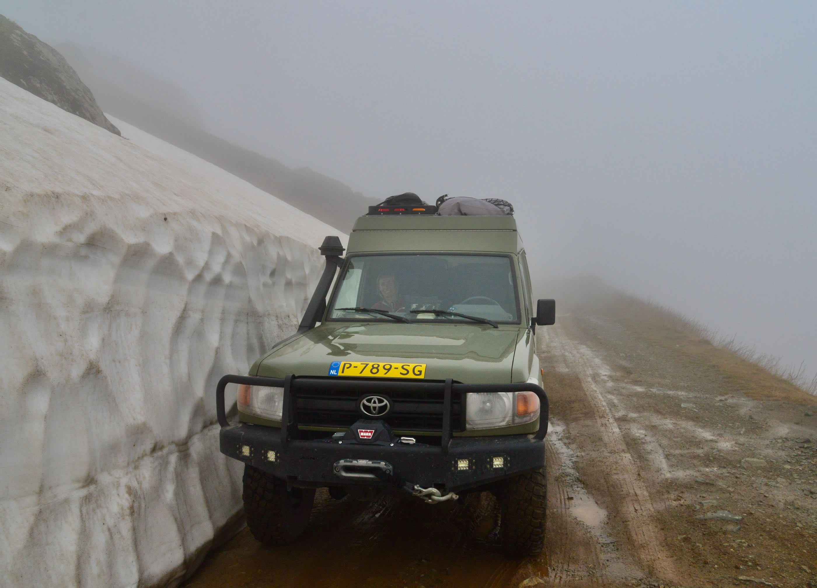 Het is mooi weer en vanaf Bayburt is het een kilometer of 40 tot aan de top. Het waait hier nogal en er ligt ook nog behoorlijk sneeuw op sommige plekken, we zien wel dat de weg is vrijgemaakt dus de weg zal wel open zijn. Terwijl we afdalen wordt het zicht steeds slechter en uiteindelijk belanden we gewoon in de wolken oftewel “ mist “ we zien nog net genoeg om de weg van het ravijn te onderscheiden. Omdraaien is geen optie daar is de weg veel te smal voor, zelfs in de bochten is geen ruimte en langzaam tokkelen we verder in de 1 laag naar beneden. In de meeste van de haarspeldbochten moet ik steken want om de draai in één keer te halen is de weg veel te smal. Voordeel van de mist is wel dat je de steile afgronden ook niet ziet… Uiteindelijk na de vele bochten wordt het zicht beter en zijn we onderaan in de vallei waar diverse watervallen zich met donderend geweld naar beneden storten. Geen goede optie om te kamperen dus rijden we nog maar een stukje door.