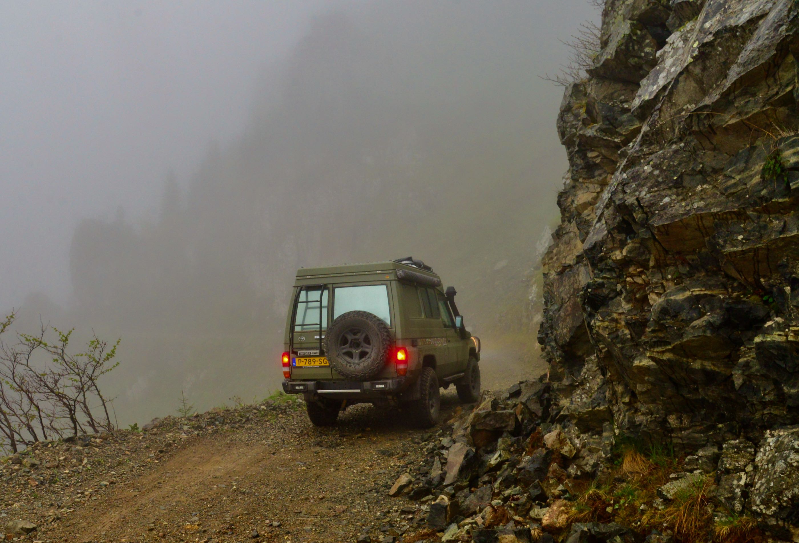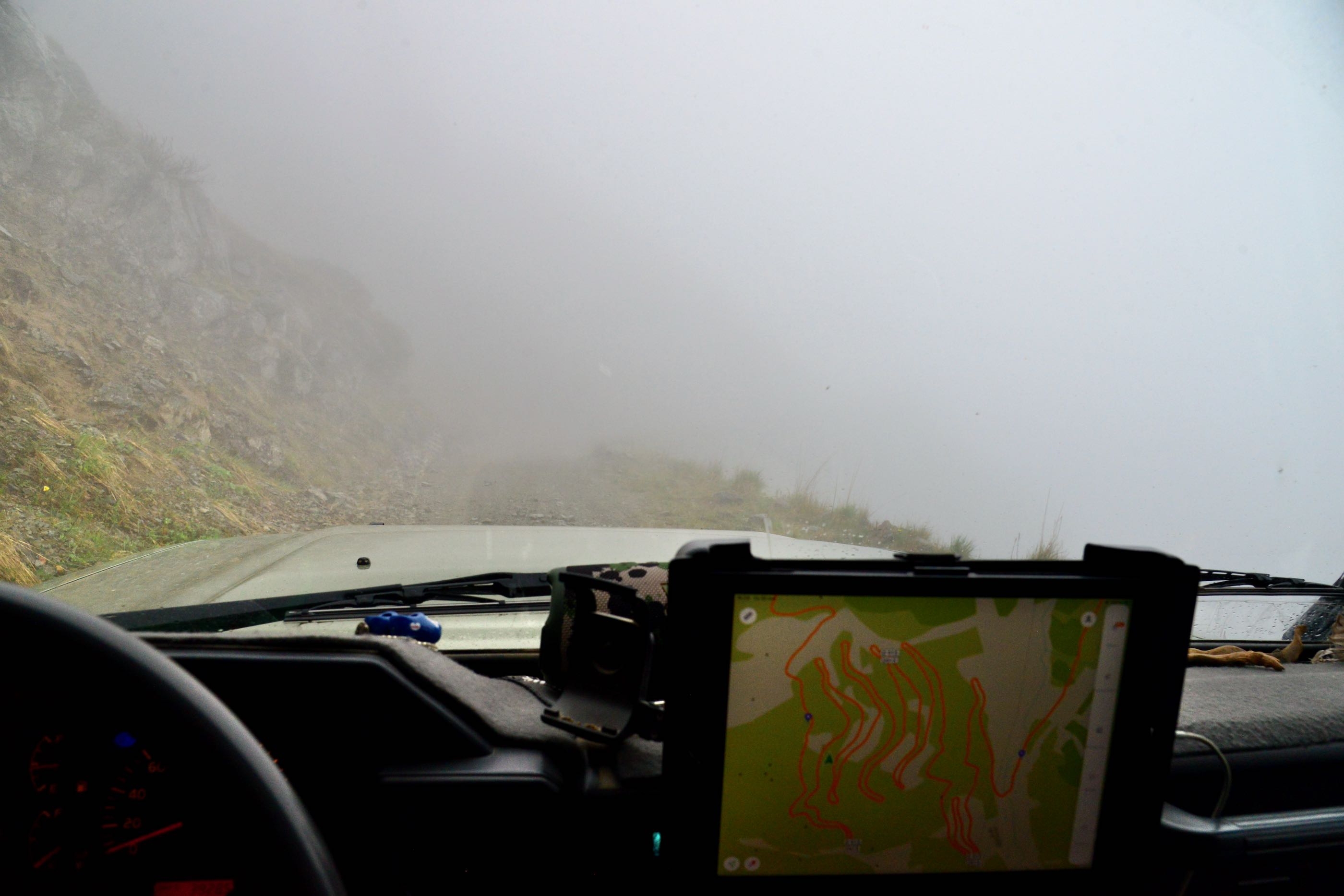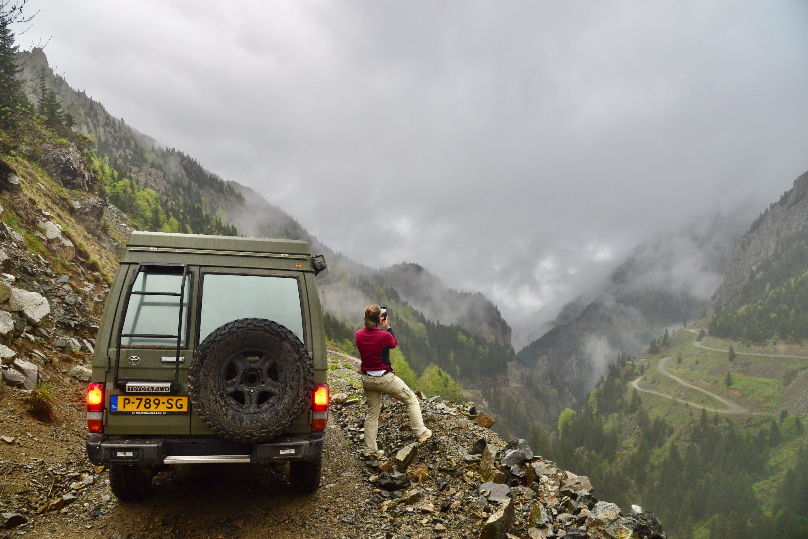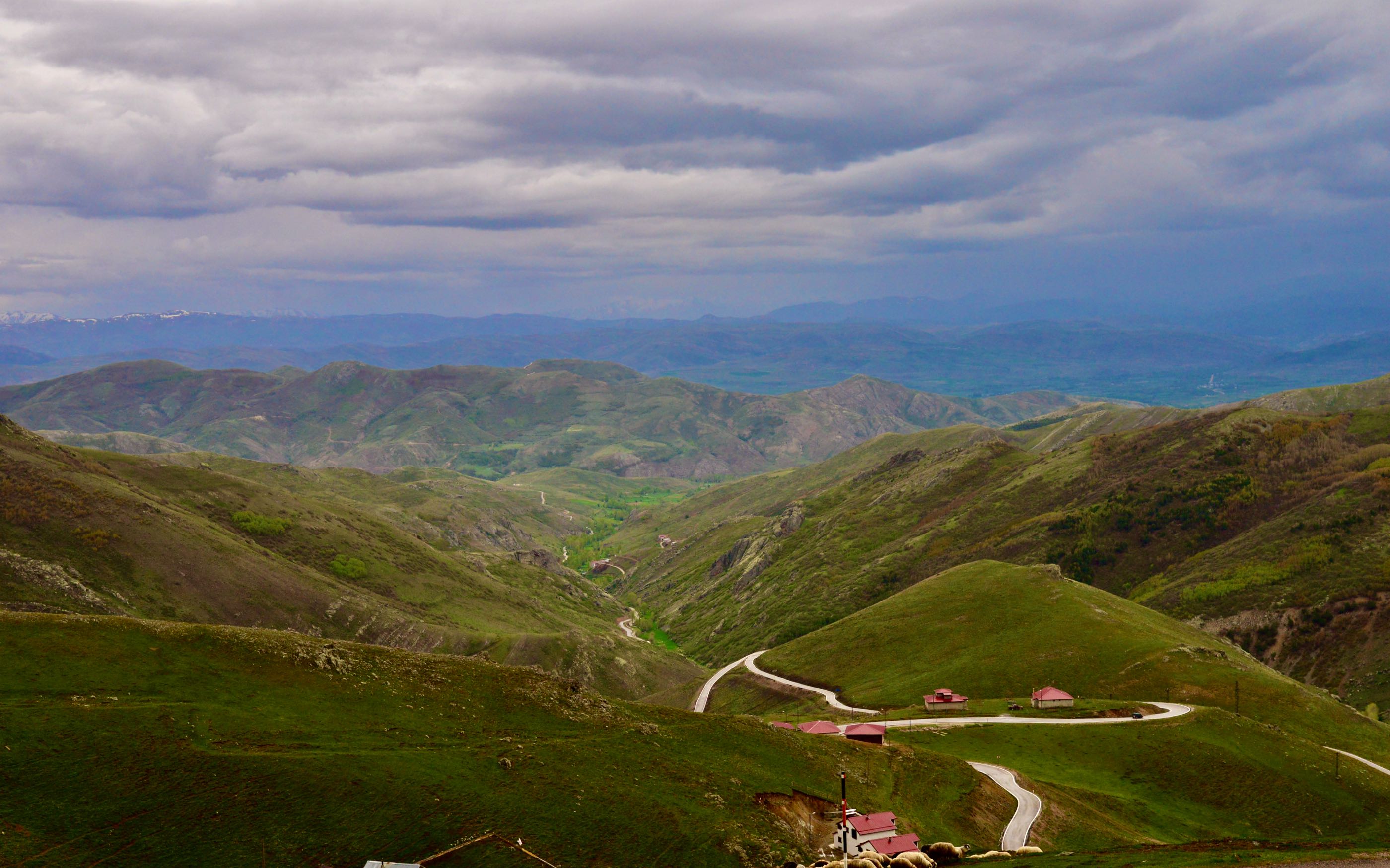 Het is mooi weer en vanaf Bayburt is het een kilometer of 40 tot aan de top. Het waait hier nogal en er ligt ook nog behoorlijk sneeuw op sommige plekken, we zien wel dat de weg is vrijgemaakt dus de weg zal wel open zijn. Terwijl we afdalen wordt het zicht steeds slechter en uiteindelijk belanden we gewoon in de wolken oftewel “ mist “ we zien nog net genoeg om de weg van het ravijn te onderscheiden. Omdraaien is geen optie daar is de weg veel te smal voor, zelfs in de bochten is geen ruimte en langzaam tokkelen we verder in de 1 laag naar beneden. In de meeste van de haarspeldbochten moet ik steken want om de draai in één keer te halen is de weg veel te smal. Voordeel van de mist is wel dat je de steile afgronden ook niet ziet… Uiteindelijk na de vele bochten wordt het zicht beter en zijn we onderaan in de vallei waar diverse watervallen zich met donderend geweld naar beneden storten. Geen goede optie om te kamperen dus rijden we nog maar een stukje door.