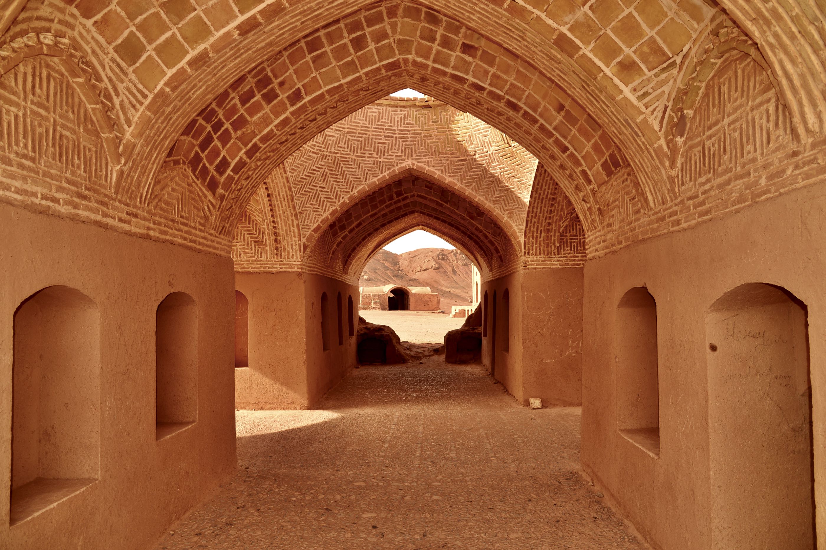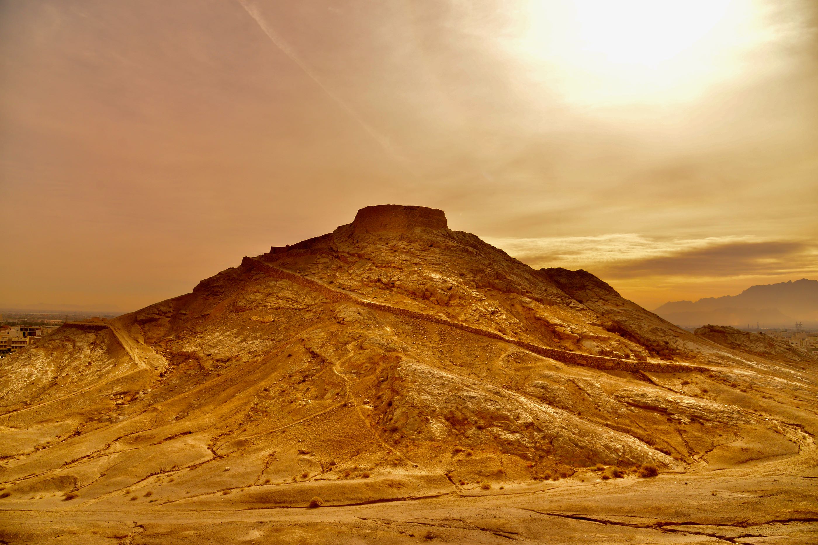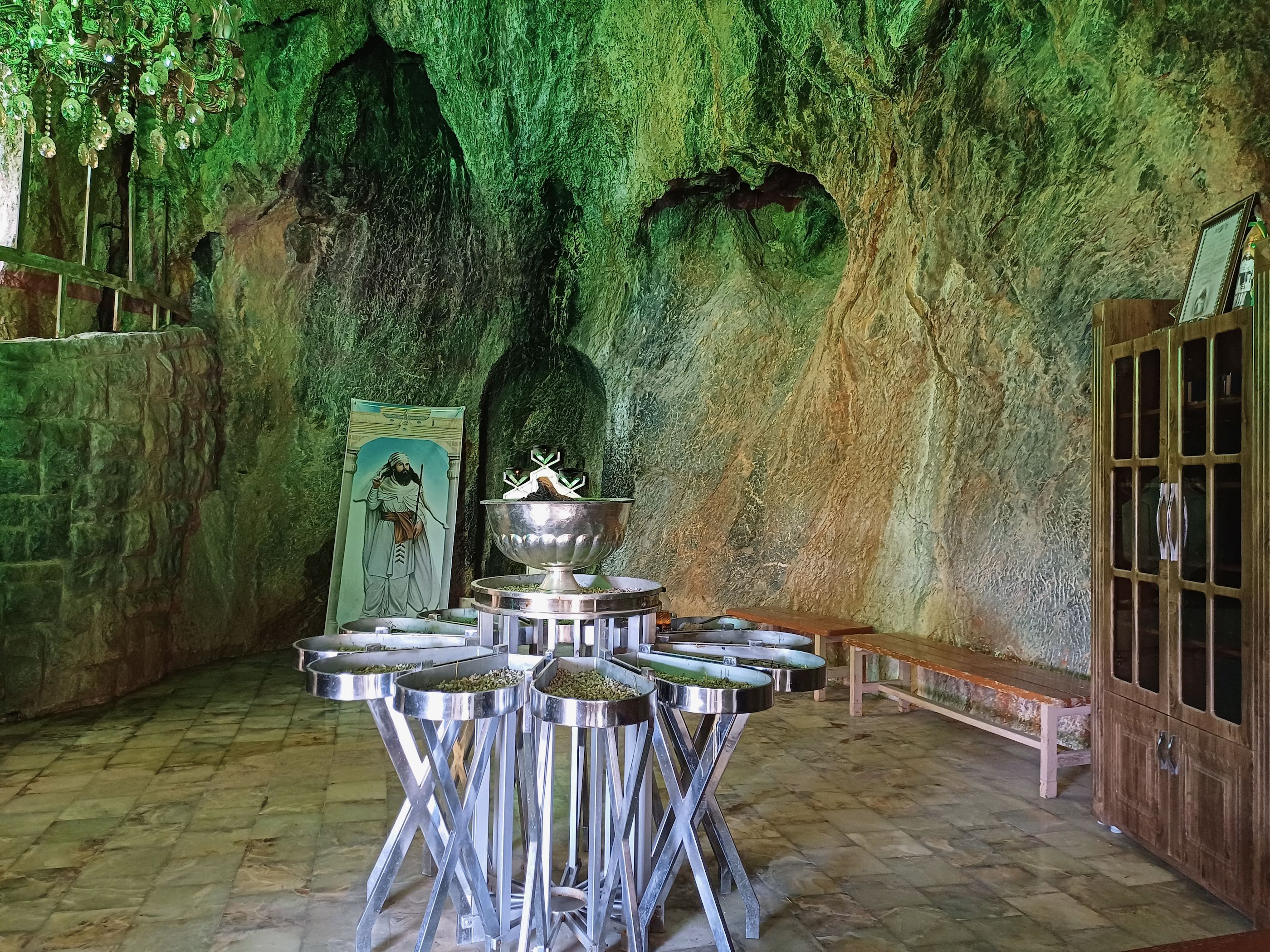 Zonde van die 100 liter diesel die we er met dit rondje doorheen hebben gejaagd gelukkig vallen de kosten van € 1,- dan weer mee. Aan het eind van de ronde was het ook weer gelukt de tank weer helemaal af te vullen. We naderen de stad Yazd volgens de top 10 lijstjes een “must see” in Iran maar eerst nog even langs “Chak Chak” dit is een bedevaartsoort tegen een bergwand aan. Het verhaal gaat dat een Princes verjaagd werd door het toen opkomende islamitsche arabieren en iets met bergen die opengingen en zich weer sloten en zo de arabieren verbijsterd achterlieten. Enfin ze kwam bijna om van de dorst maar toen was er deze plek want chak chak betekent druppelen, er sijpelde dus water uit de berg en ze leefde nog lang en gelukkig. Na €3,- p.p te hebben betaald mochten we een aantal eindeloze trappen oplopen om uiteindelijk bij een soort grot aan te komen waar wat lichtjes branden niet echt bijster interessant.