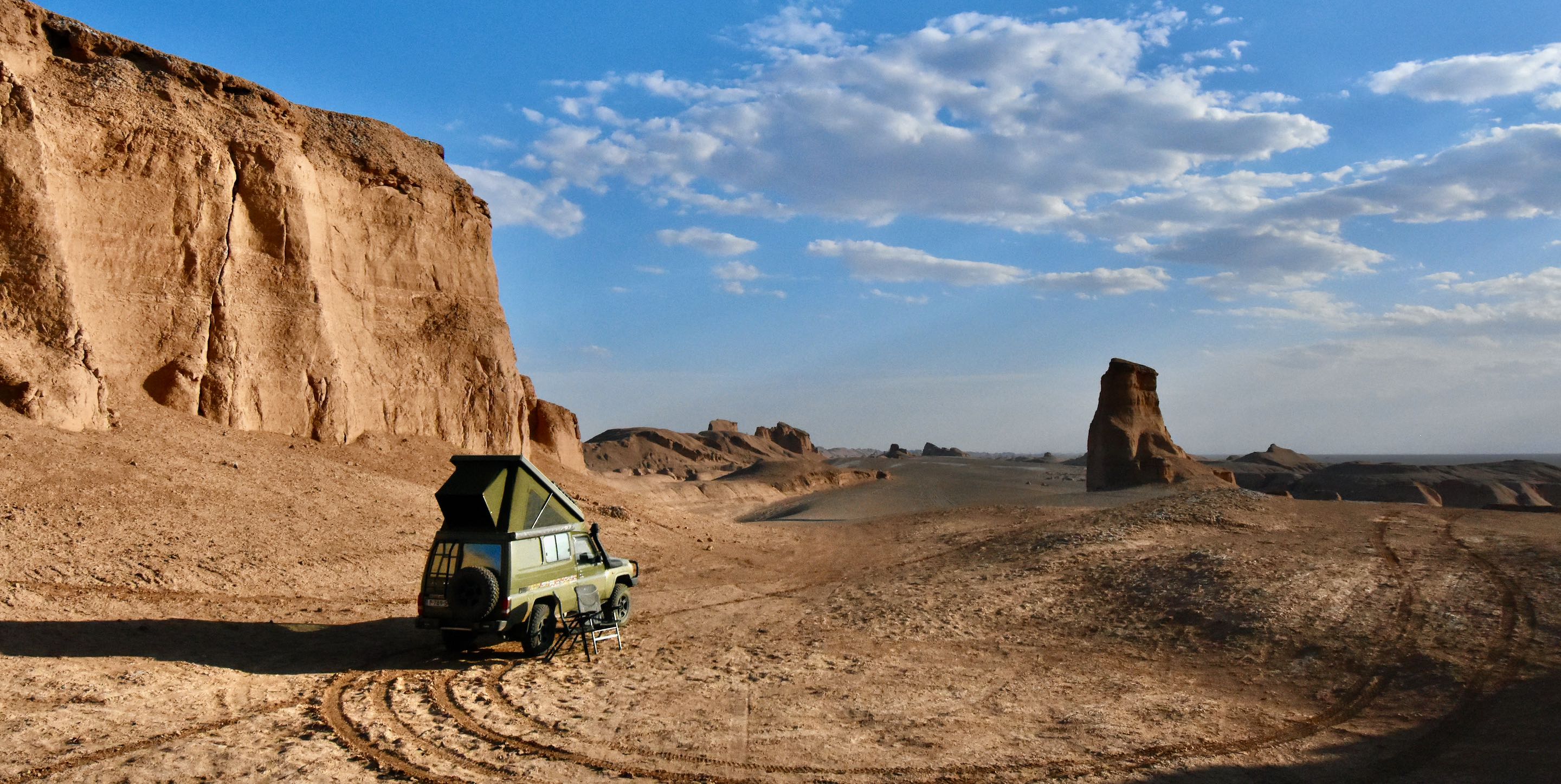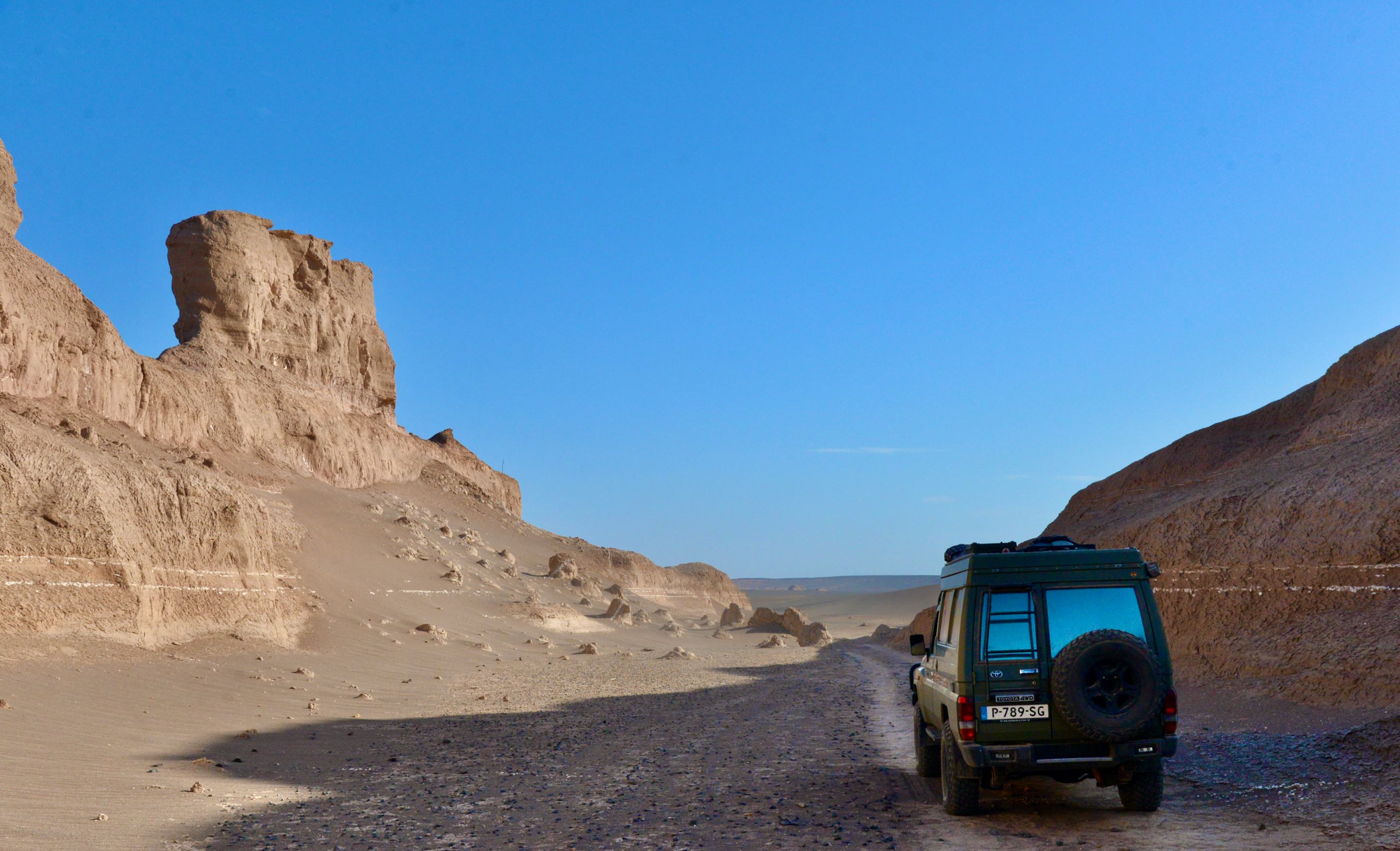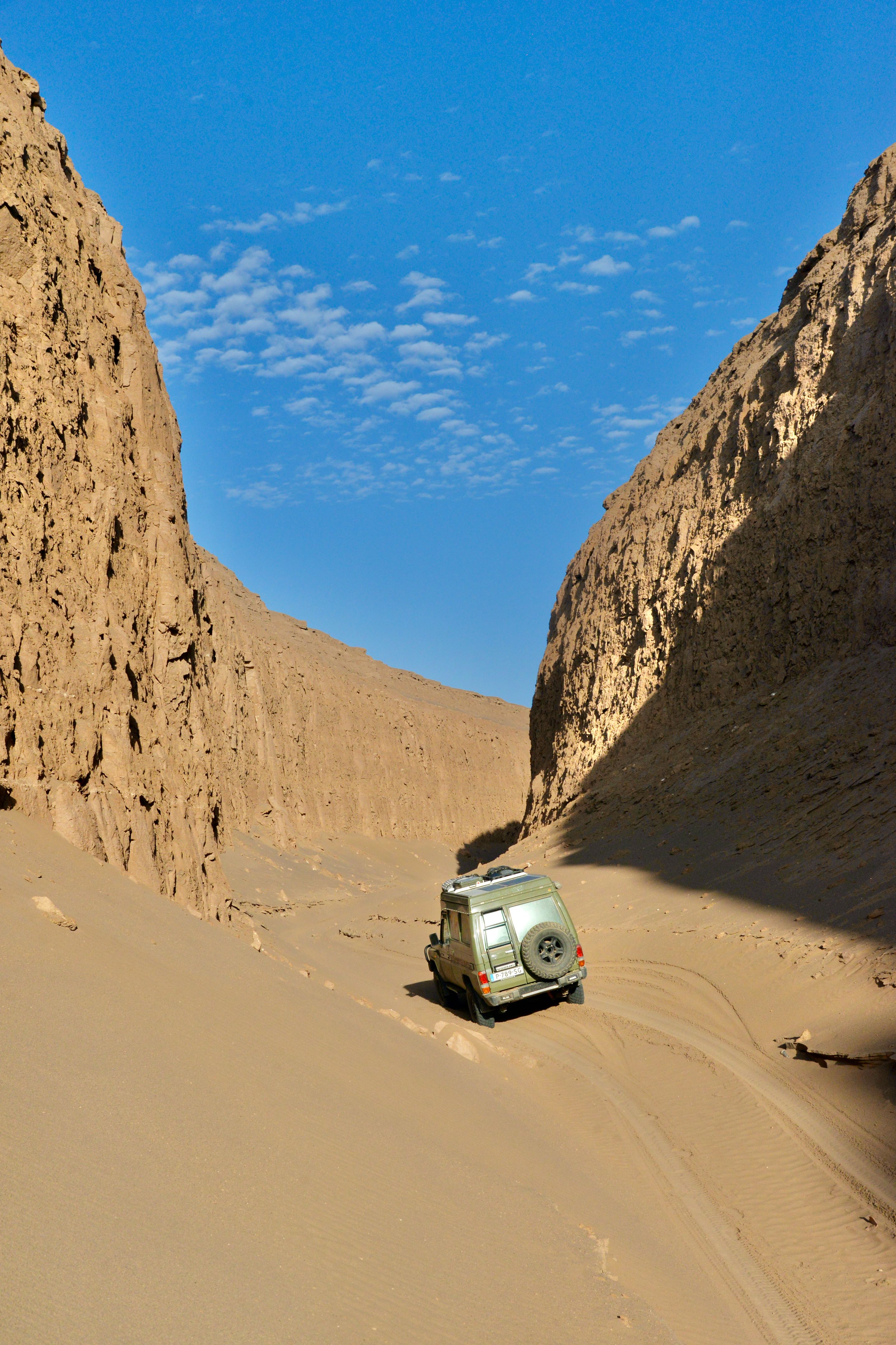 In de schaduw van een kalut maken we koffie en genieten van de omgeving. We besluiten nog zo’n 20 kilometer verder te rijden van daar begint de zogenaamde “ Snake Canyon”. In Iran wordt deze canyon “ Zaban e Mar” genoemd. Een reusachtige canyon lopend door het landschap, de naam snake canyon komt vanwege de vorm van de slangentong, een y als het ware. We duiken het mulle zand van de canyon in totdat we niet verder kunnen, draaien is nog een hele opgaaf vanwege de krappe ruimte.