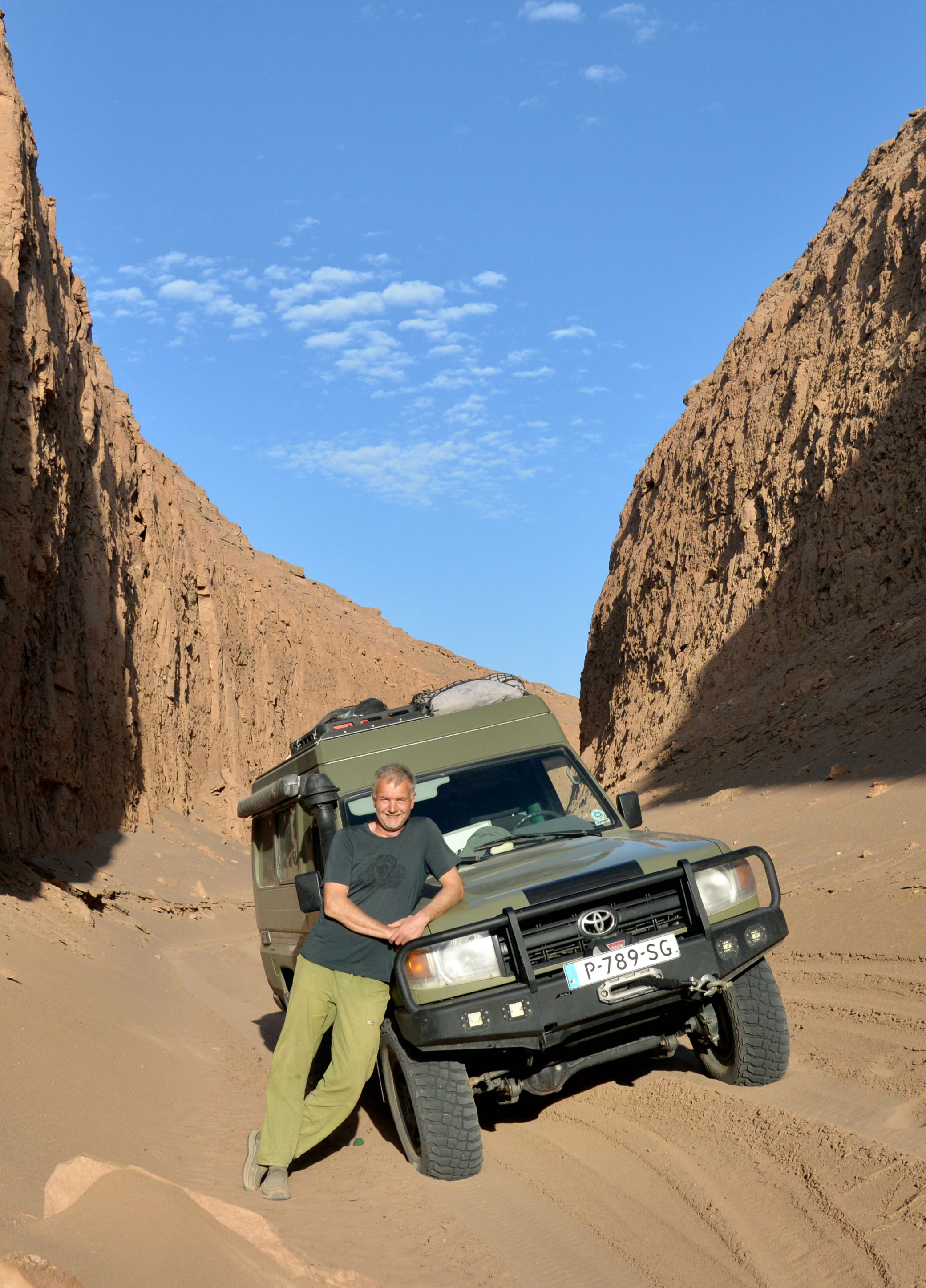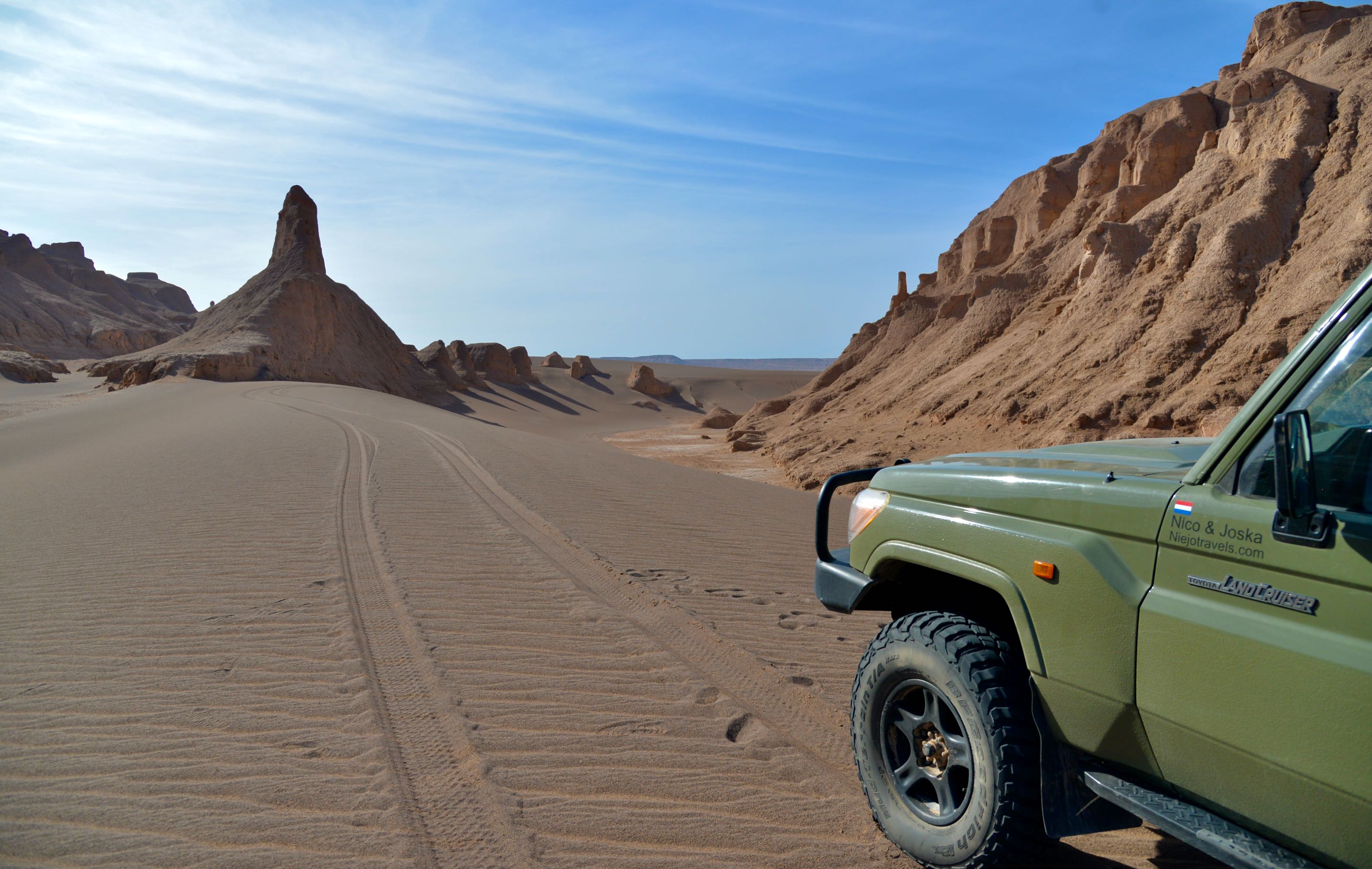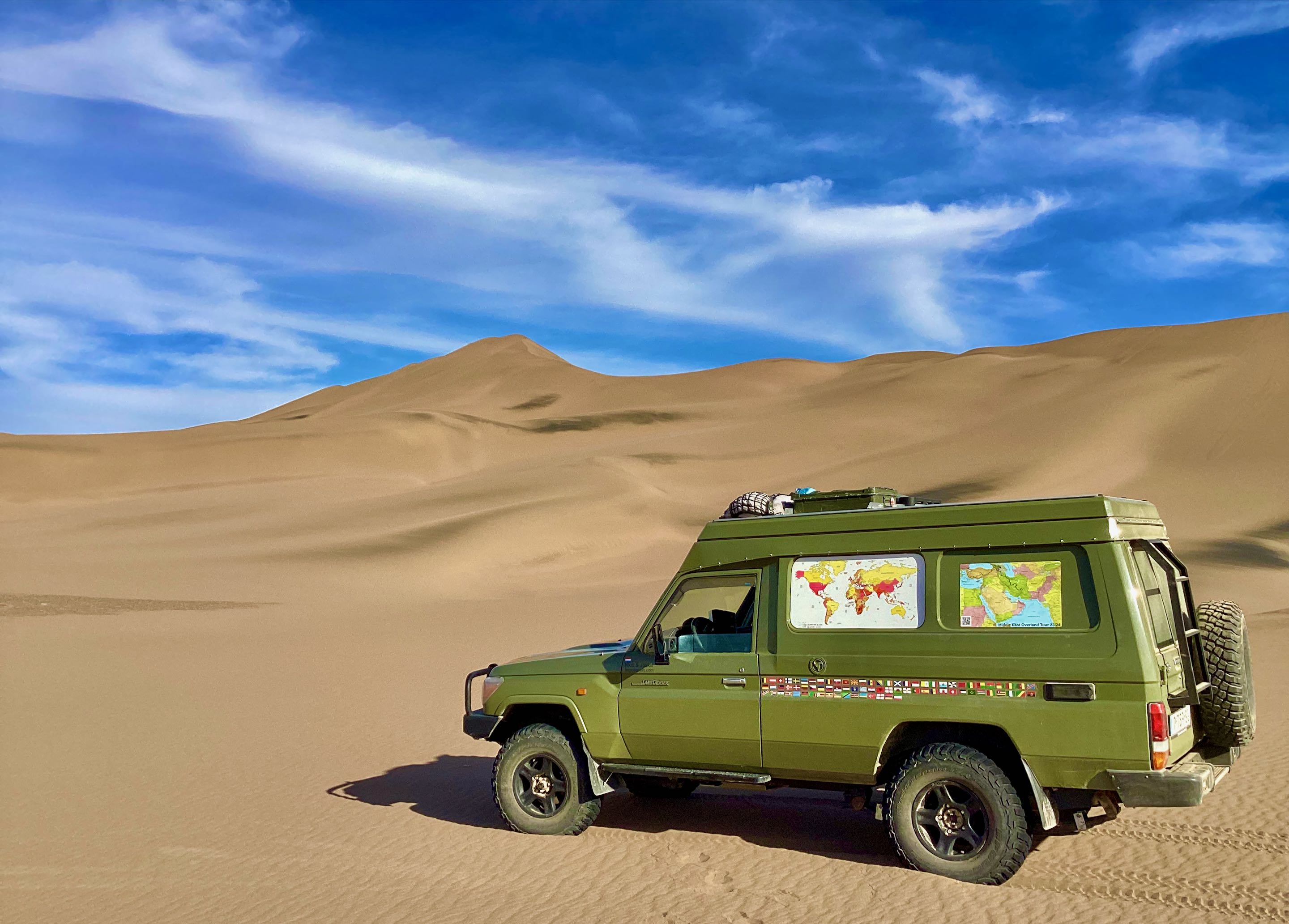 De spanning in de bandjes gaat nog wat lager omdat we het duinengebied naderen en met te harde banden is het niet prettig rijden in het zand en je rijdt je sneller vast. Het is nog zo’n 40 kilometer verder de woestijn in voordat onze route naar links afslaat. Het blijft geweldig rijden hier, dit is een van de mooiste woestijnen die we tot nu toe hebben bezocht. Het landschap veranderd maar weer eens we naderen nu echt het zand, deze regio staat bekend om zijn mega hoge duinen tot wel 300 meter. Voor dat je er erg in hebt rijd je er dwars doorheen, de motor van de toyo jankt in de toeren, in de 2 hoog komen we net boven met onze zware bak. Er volgt een duin met een spitse top…poeh net genoeg gang om er niet op te blijven hangen maar wat een afdaling!!! dat hadden we niet verwacht maar we surfen soepeltjes tientallen meters naar beneden. Het echte werk gaar nu beginnen, gelukkig kunnen we vers gereden sporen volgen zodat we onze eigen route niet hoeven te zoeken en ons kunnen concentreren op de duinen. Nog eenmaal dalen we tientallen meters van een plateau af om uiteindelijk in een nog mooiere omgeving te belanden, er is een korte route rechtsaf die eindigt bij een mega hoge zandduin met een sculpturen tuin ervoor.