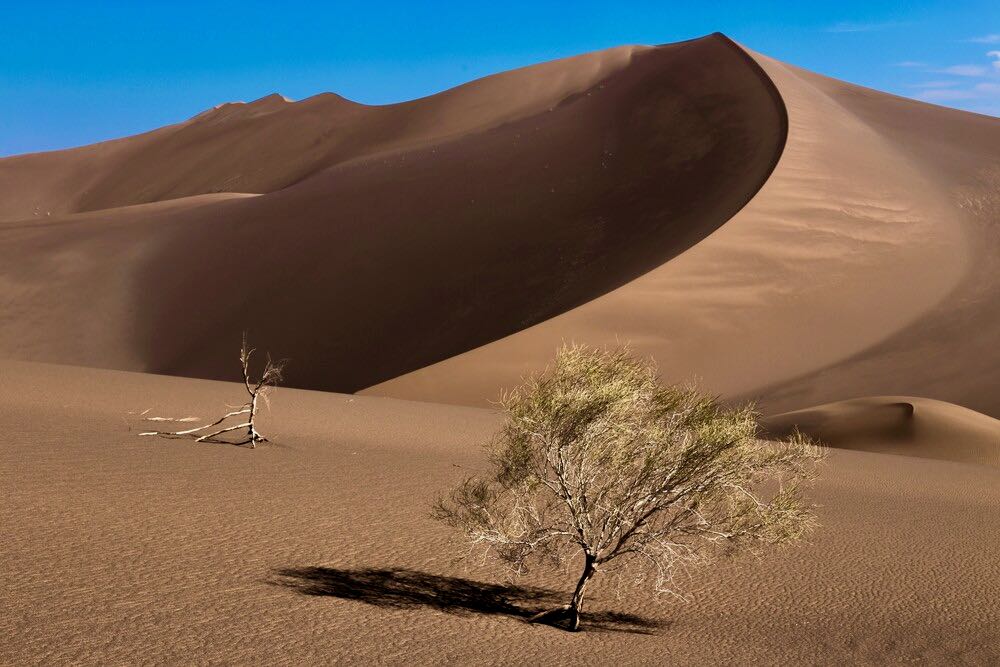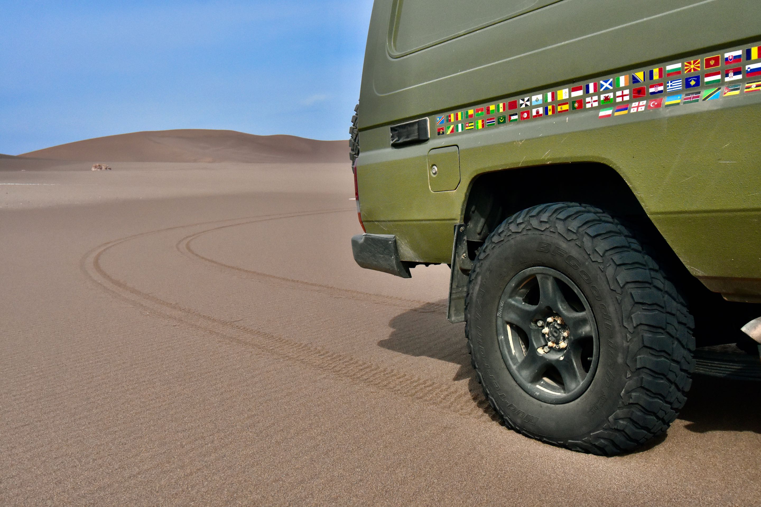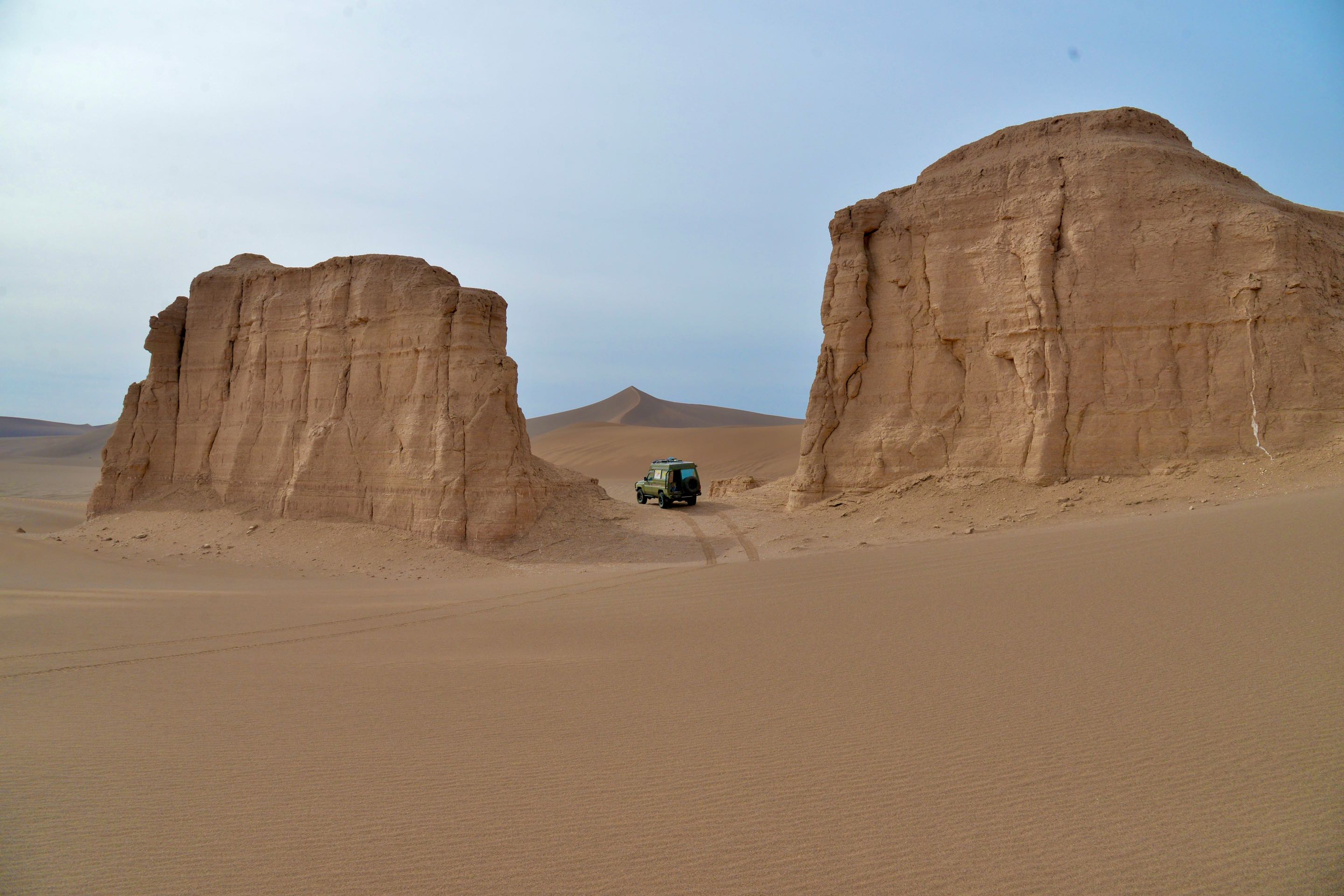 De spanning in de bandjes gaat nog wat lager omdat we het duinengebied naderen en met te harde banden is het niet prettig rijden in het zand en je rijdt je sneller vast. Het is nog zo’n 40 kilometer verder de woestijn in voordat onze route naar links afslaat. Het blijft geweldig rijden hier, dit is een van de mooiste woestijnen die we tot nu toe hebben bezocht. Het landschap veranderd maar weer eens we naderen nu echt het zand, deze regio staat bekend om zijn mega hoge duinen tot wel 300 meter. Voor dat je er erg in hebt rijd je er dwars doorheen, de motor van de toyo jankt in de toeren, in de 2 hoog komen we net boven met onze zware bak. Er volgt een duin met een spitse top…poeh net genoeg gang om er niet op te blijven hangen maar wat een afdaling!!! dat hadden we niet verwacht maar we surfen soepeltjes tientallen meters naar beneden. Het echte werk gaar nu beginnen, gelukkig kunnen we vers gereden sporen volgen zodat we onze eigen route niet hoeven te zoeken en ons kunnen concentreren op de duinen. Nog eenmaal dalen we tientallen meters van een plateau af om uiteindelijk in een nog mooiere omgeving te belanden, er is een korte route rechtsaf die eindigt bij een mega hoge zandduin met een sculpturen tuin ervoor.