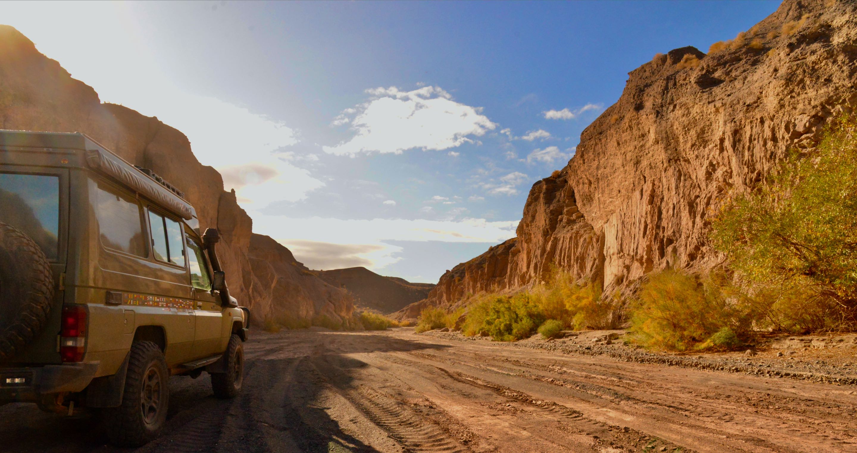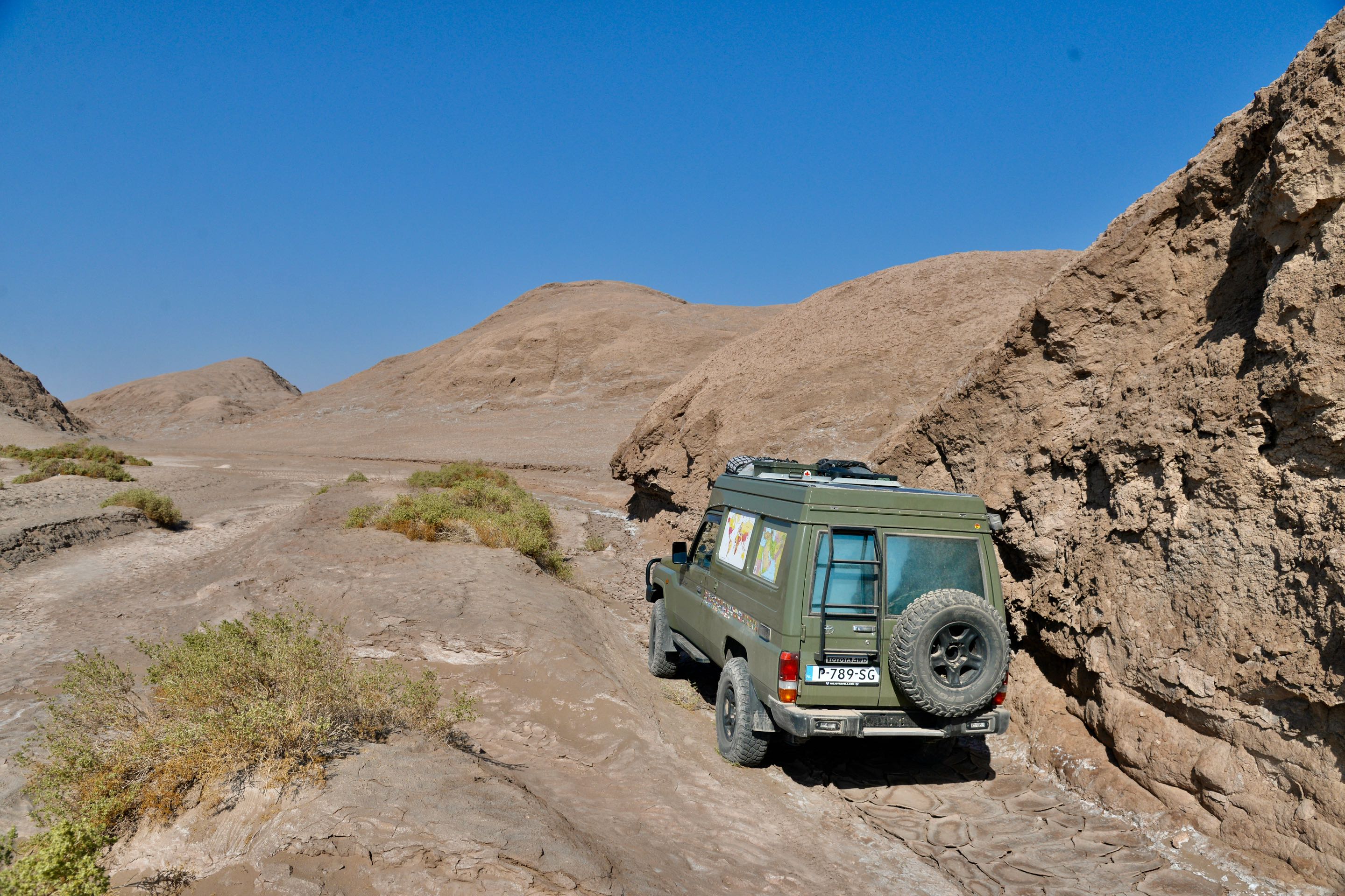 We naderen weer het punt waar we eerder waren en rijden nu in omgekeerde richting. Het lijkt alsof we hier niet eerder geweest zijn. Na een tietal kilometers wordt het weer vlakker en rest ons de saaie 40 km kiezelwoestijn terug naar de weg. We besluiten weer te gaan kamperen op dezelfde plek als de heenweg mooi beschut tussen de “ Kalutsen”. Dit gebied zo’n 40 km vanaf Shadad wordt veel bezocht het is één groot speelterrein voor 4×4 auto’s. De volgende ochtend als we weg rijden besluiten we niet de afslag te nemen volgens de navigatie maar de vele sporen te volgen die uiteindelijk ook wel naar de verharde weg zullen leiden (dachten we). Kilometers lang leidt de highway van tracks ons steeds verder richting Shadad maar een afslag naar de weg komt niet, hebben we ons vergist? Vele maken vele afdalingen die te hoog zijn om terug te rijden, we ondernemen nog wel een poging maar het is te gevaarlijk scheef en te steil dat halen we nooit. We worden omringd door rijen rotsen met zand ertussen, we proberen steeds meer naar rechts te komen waar de weg is. Stukje vooruit, ja hier kunnen we tussendoor, stukje vooruit en weer naar rechts. Sporen zijn er inmiddels niet meer, en dan ineens rotsen weg en open uitzicht maar nog steeds geen weg. We belanden in een soort mega grote wadi (opgedroogd stroomgebied van een rivier) vele greppels en geulen liggen voor ons en de route is rechtdoor.