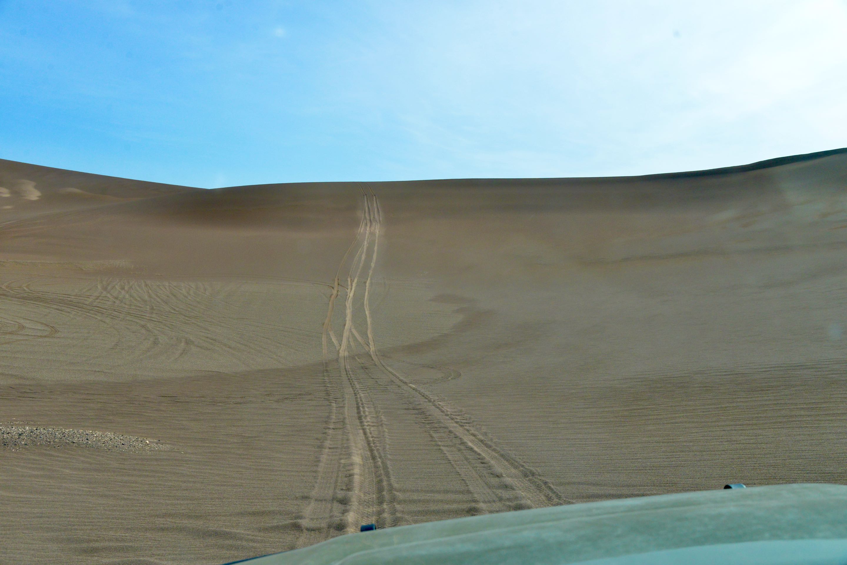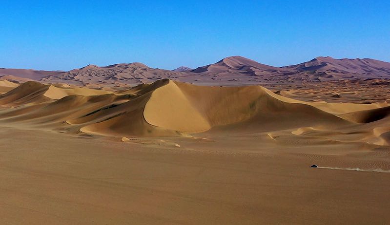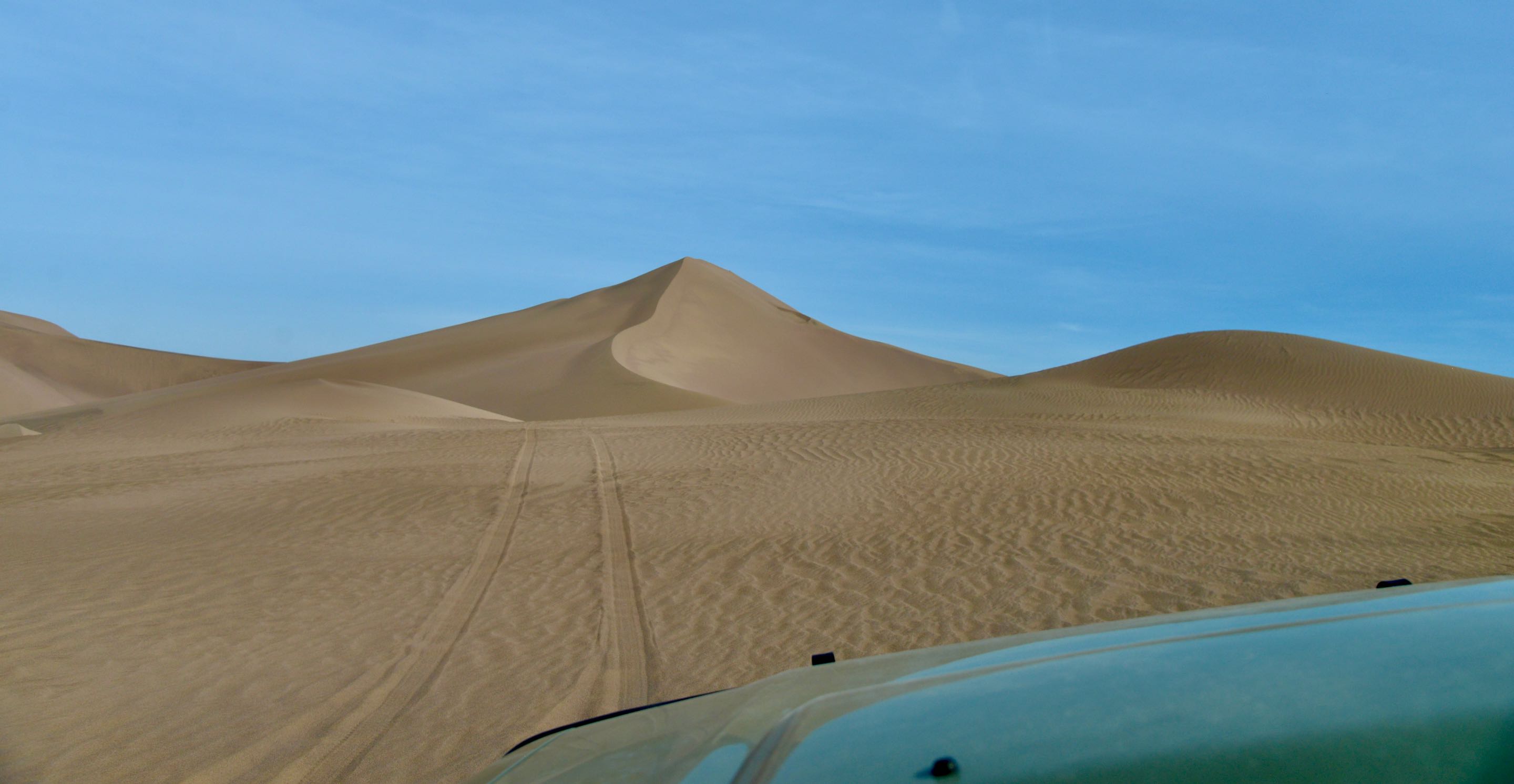 We besluiten een duik te nemen in het meer wat we zien in de verte maar naarmate we dichtbij komen lijkt het meer steeds op te schuiven, luchtspiegelingen oftewel “fata morgana”. De hoge duinen die later opdoemen blijken wel echt, dit is echter weer zand van een andere structuur en kleur ook de vorm van de duinen lijkt meer op die van in de Sahara. Je moet er echt in rijden om “ te spelen” we besluiten maar om er langs te rijden en geen risico te nemen om vast te komen zitten het is mooi genoeg zo.