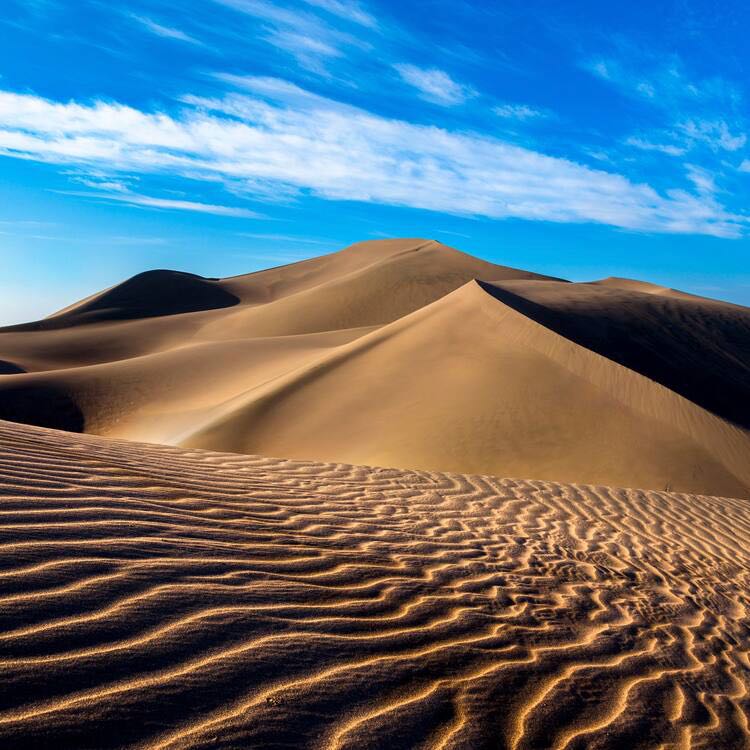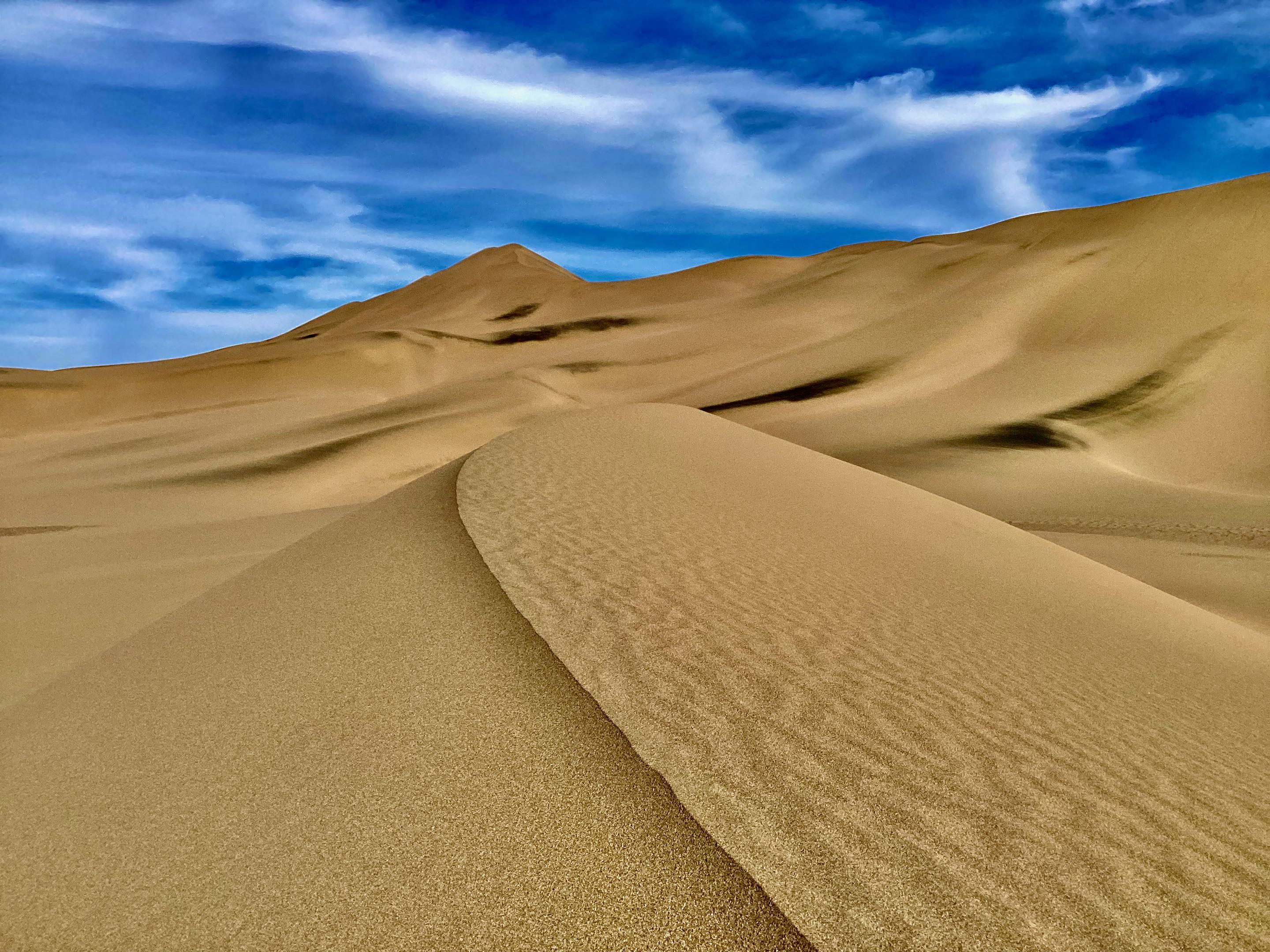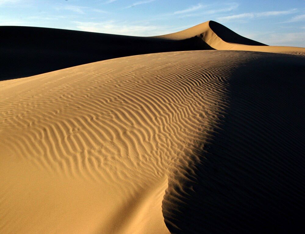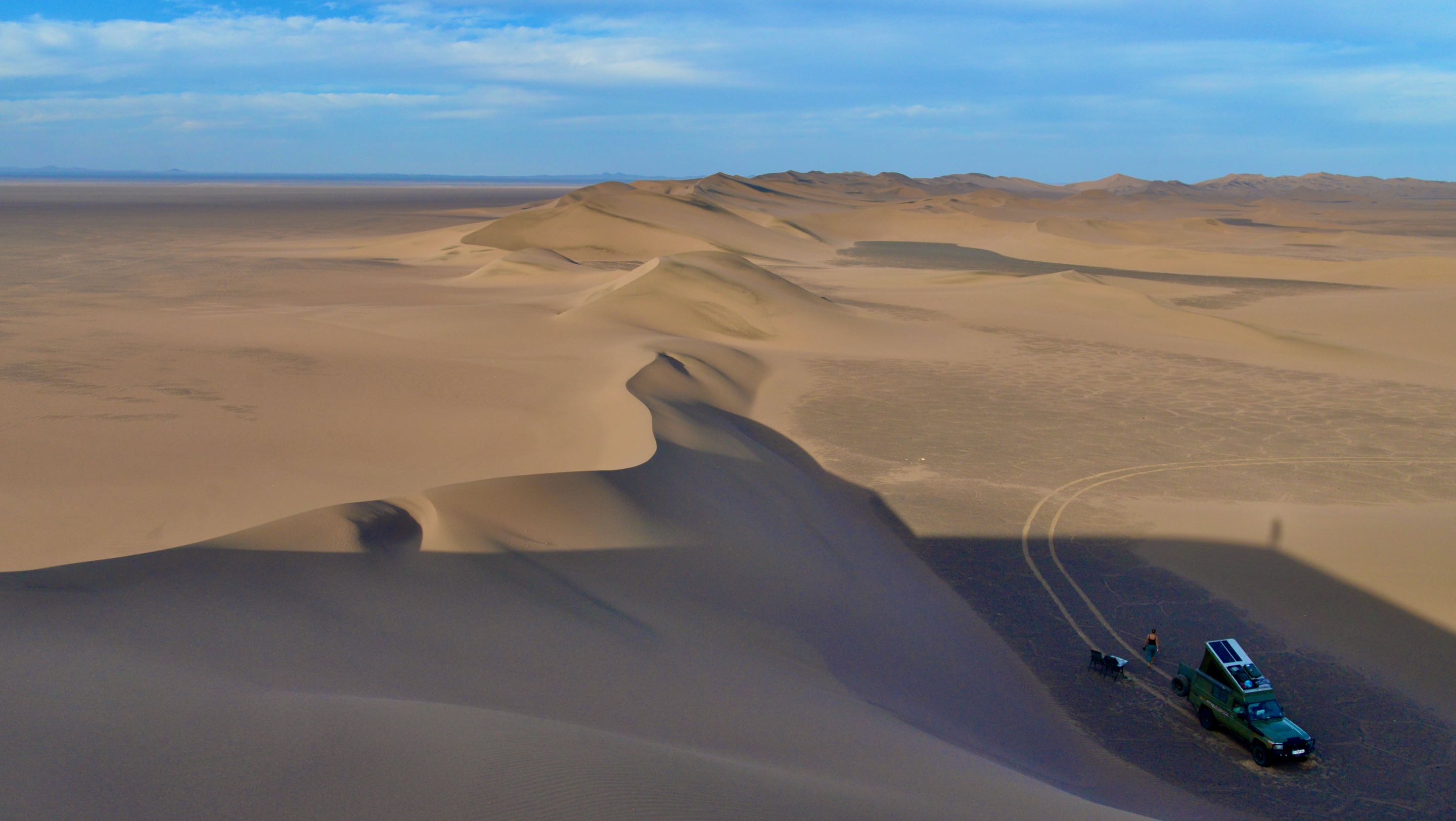 We besluiten een duik te nemen in het meer wat we zien in de verte maar naarmate we dichtbij komen lijkt het meer steeds op te schuiven, luchtspiegelingen oftewel “fata morgana”. De hoge duinen die later opdoemen blijken wel echt, dit is echter weer zand van een andere structuur en kleur ook de vorm van de duinen lijkt meer op die van in de Sahara. Je moet er echt in rijden om “ te spelen” we besluiten maar om er langs te rijden en geen risico te nemen om vast te komen zitten het is mooi genoeg zo.