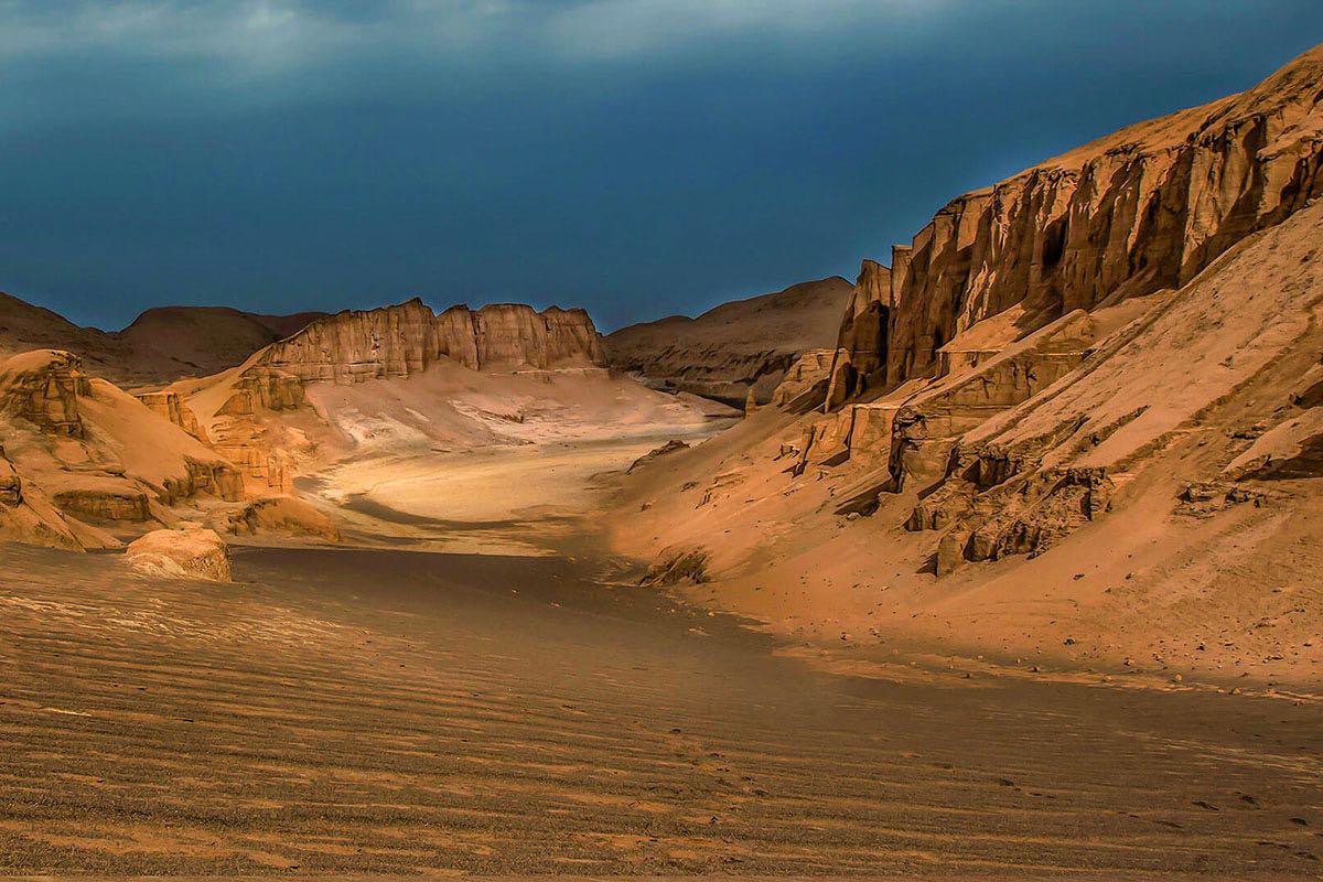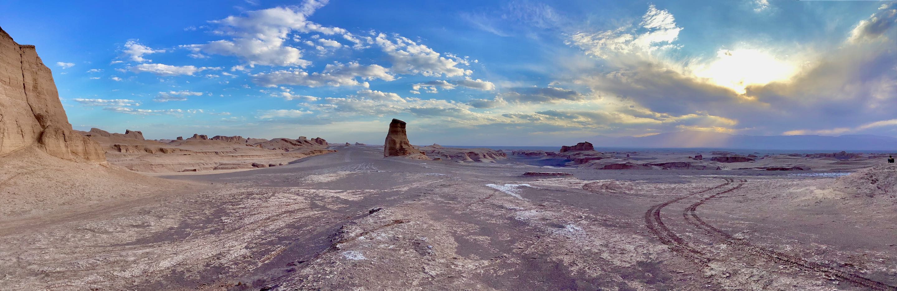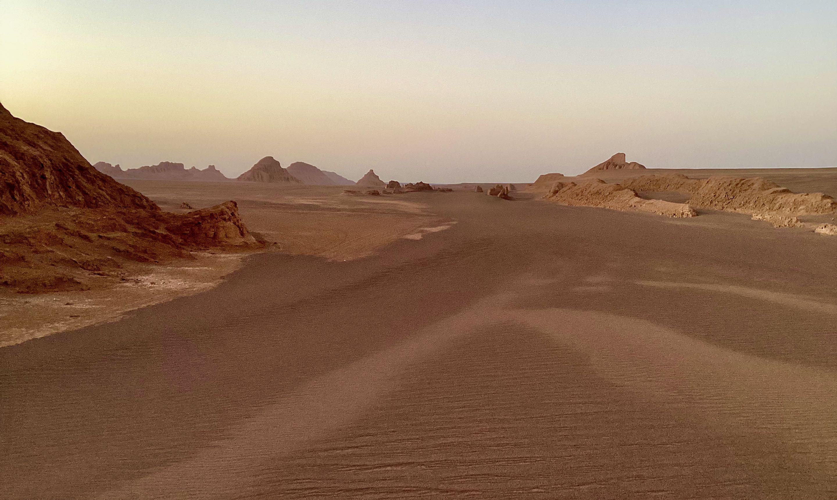 Een beetje onwennig verlaten we het asfalt, laten de banden aflopen naar een comfortabeler rijgedrag en vervolgen onze weg. De route is goed zichtbaar, aangezien het hier bijna nooit regent. De Luts is één van de droogste plekken van Iran en in de zomer wordt het hier ook onaangenaam heet. Je kan hier in de zomer amper lopen aangezien ze hier op het zwarte zand een grondtemperatuur hebben gemeten van 70,7 gr Celsius. Er zijn maar weinig plekken op aarde waar het nog warmer wordt. In de zomer is de luchttemperatuur hier ruim boven de 50 gr, voor mens en machine is het dan niet te doen. Maar nu in november ’23 is het winter en is de temperatuur aangenaam. Na zo’n 40 kilometer over de vlakte te hebben gereden verandert ineens het landschap, het is alsof we een filmset binnen rijden zo mooi. Het is groots en geweldig om door heen te rijden, de “kalutsen” liggen her en der verspreid door het heuvelachtige landschap en de route slingert er als het ware doorheen. We zijn er een beetje stil van.
