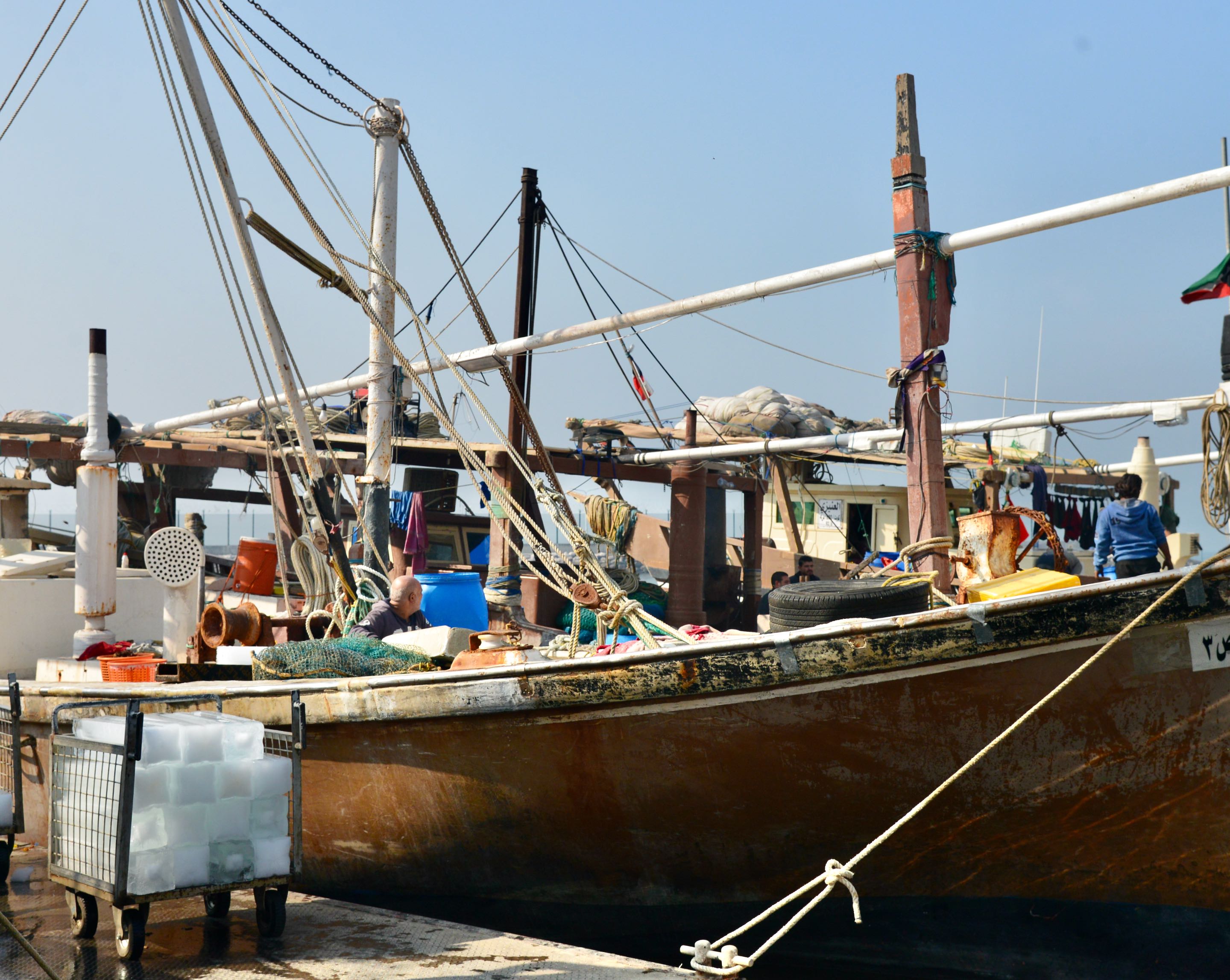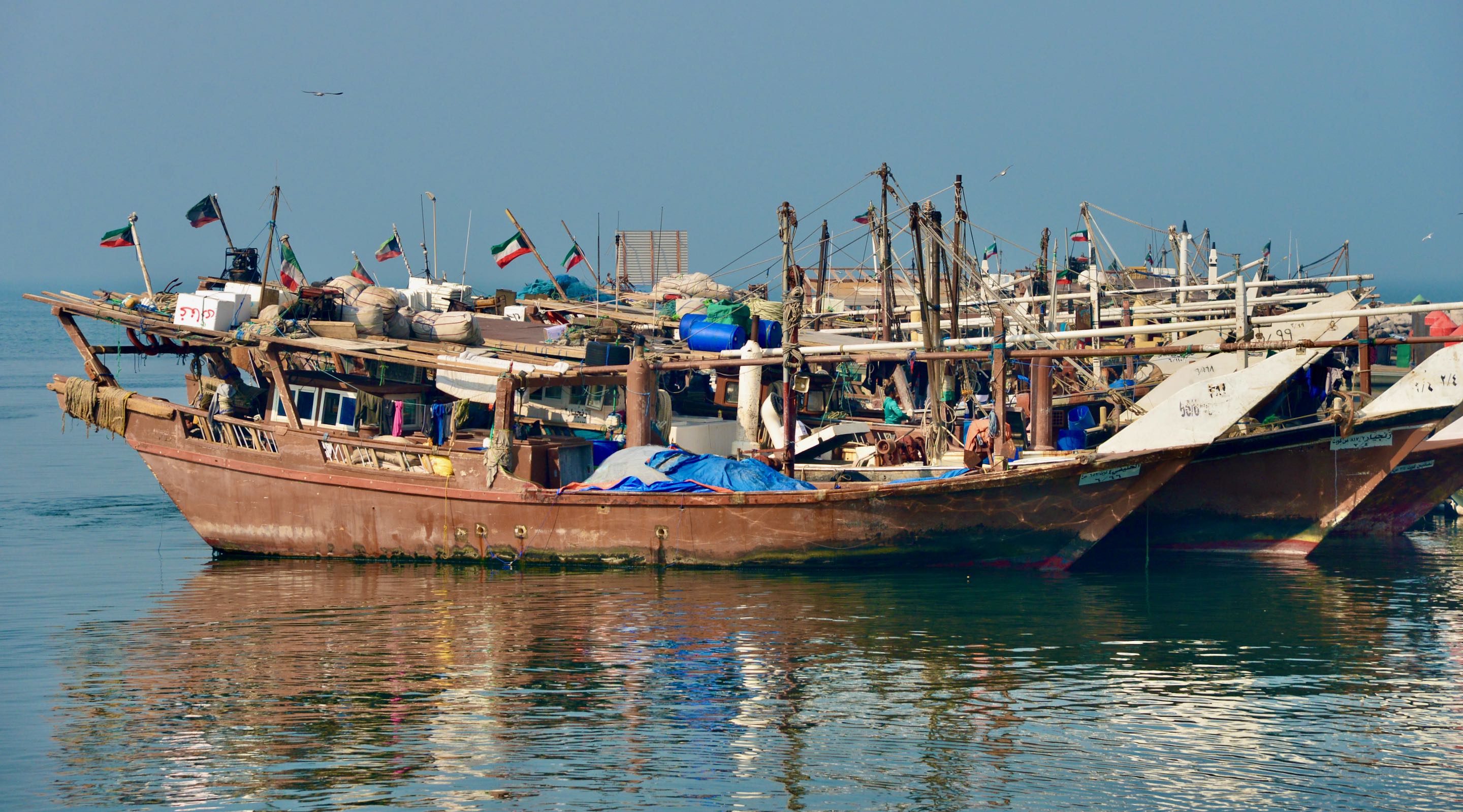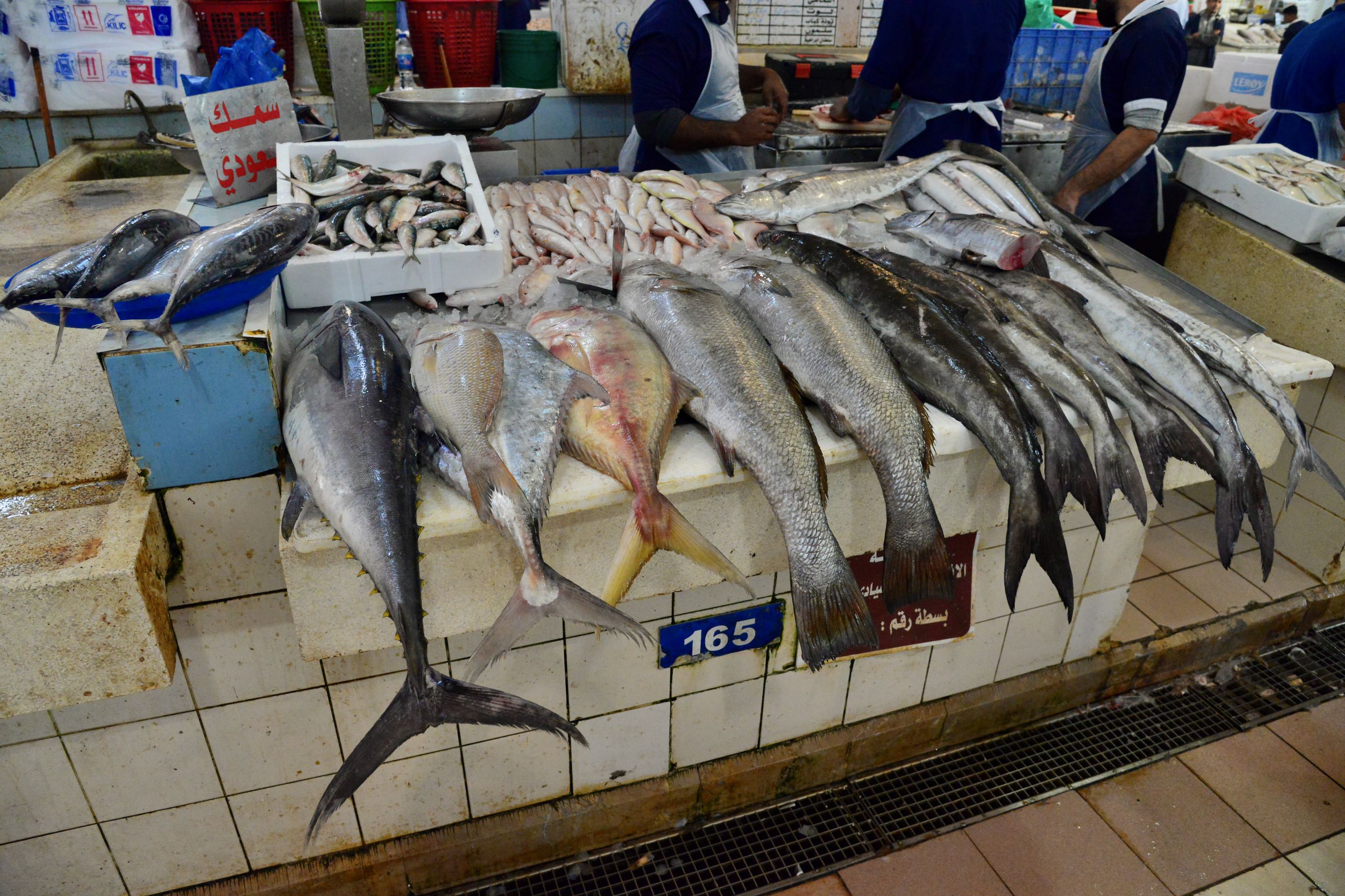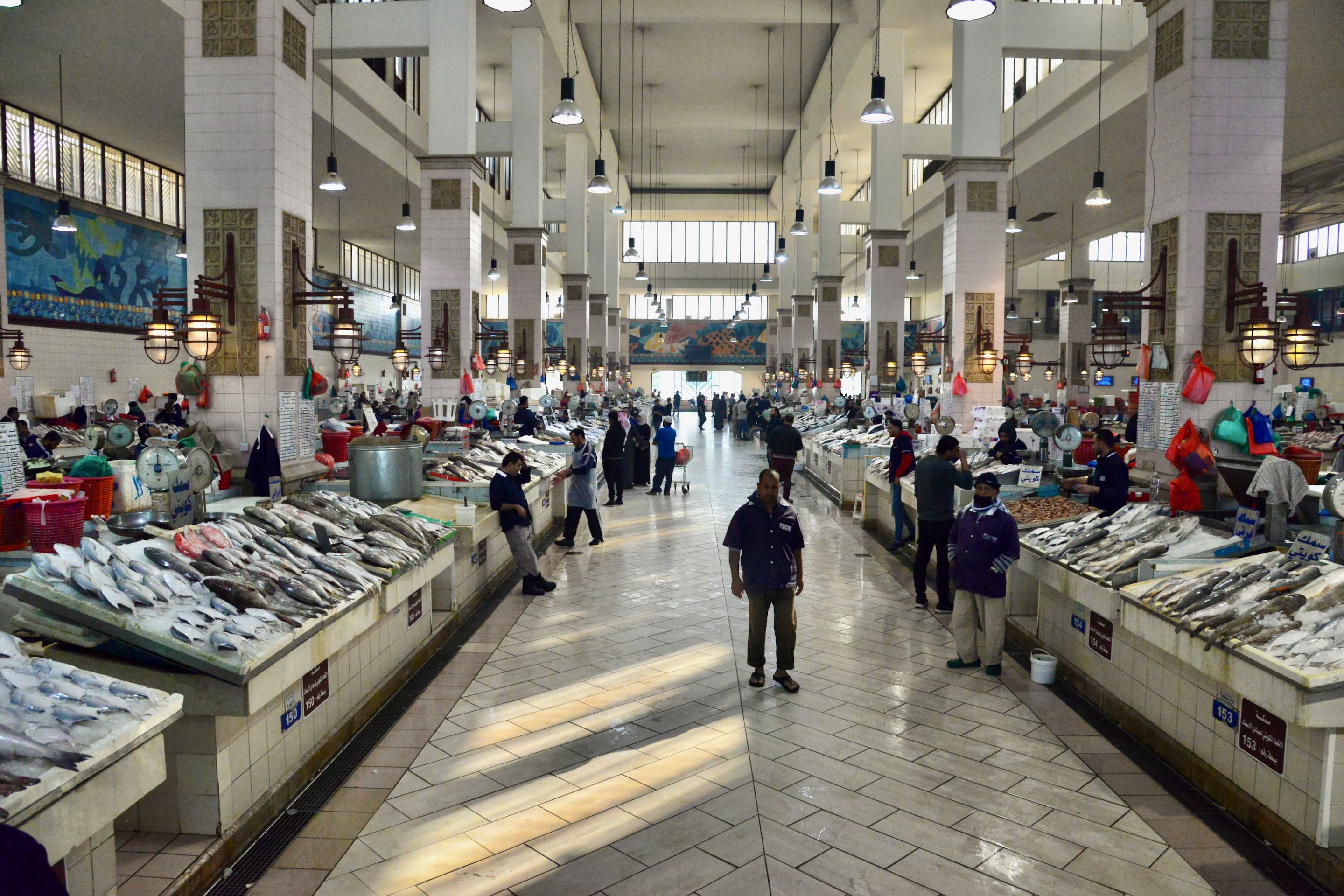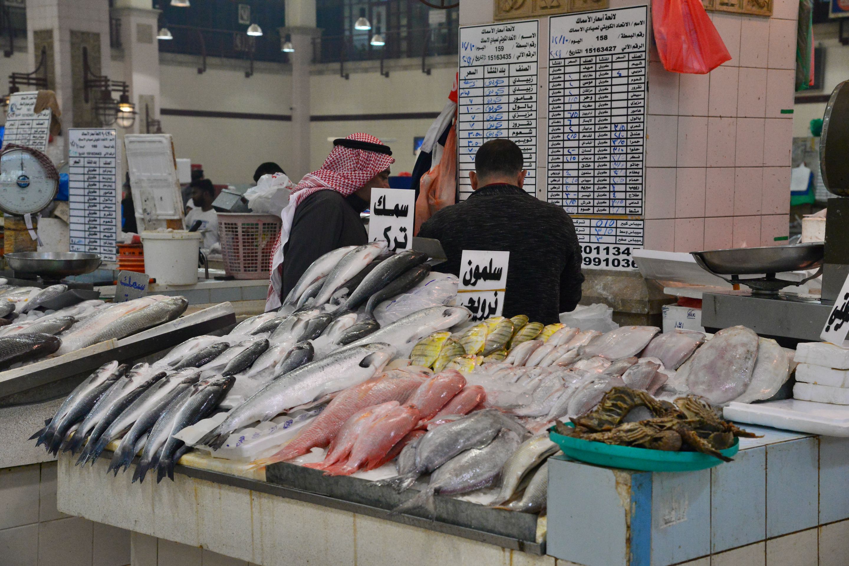 Vanaf de brug heb je normaal een mooi zicht op de skyline van de stad maar helaas het is verre van helder, de stad is zelfs niet eens te zien. Van de eigen bevolking de Koeweitie werkt 80% voor de overheid heeft meestal een royaal salaris en gaat op de leeftijd van 55 met pensioen. De andere 20% is waarschijnlijk “ farmer” en leeft dan ook met zijn kudde dromedarissen in het land cq woestijn. Koeweit stad is een miljoenen stad en er even doorheen vergt het nodige geduld. De afstand van noord naar zuid is zo’n 65 km, ter vergelijking vanaf de grens met Irak naar de grens met Saudi Arabië is totaal 225 km. Het geheel is een beetje naar Amerikaans model ingericht en ook het aanbod en dan met name het fastfood is USA. Ik kampeer nog met Mikeal en Corrina maar gedurende de dag gaat ieder zijn eigen weg. Ik besluit een bezoekje te brengen aan de vismarkt, ik vind het altijd leuk te zien wat er zoal gevangen wordt en ik kan u zeggen het aanbod uit de zee hier is zeer divers.