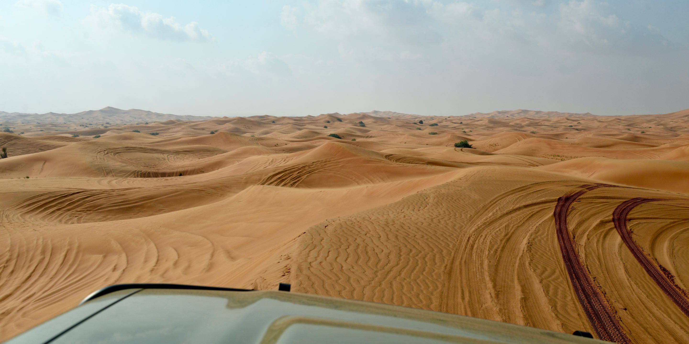 Als je googelt op vakantie Dubai ontbreekt in de meeste advertenties ook niet het tochtje door de rode zandduinen op maar een uurtje rijden van de meeste hotels. Een uitgelezen mogelijkheid om deze zelf maar eens te doorkruisen aangezien ik me nog een paar dagen moet vermaken. Het rode zand nodigt uit en ik verlaag de spanning in de banden om zo meer draagvlak te krijgen in het zand, als je dat niet doet graaf je je snel vast als het zand wat losser wordt.