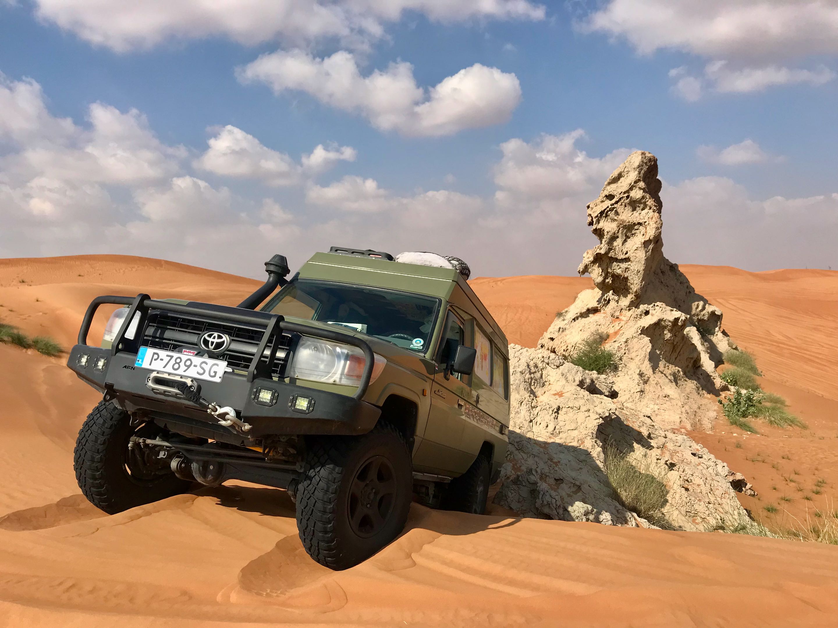 Na enig graven voor de banden en een bultje erachter waag ik een poging, lage gearing, sperren aan en gaan… Nee k.t hij zakt nog wat verder weg. Ik laat de banden nog verder af naar 0,8 bar en graaf nogmaals, alles klaar gas op de plank en yes! het lukt. Poeh dat was op het nippertje. Na een kampeernachtje in de duinen besluit ik de volgende dag maar eens richting de wat hogere duinen te rijden. Op een aantal kilometers van mijn plek ligt de “super bowl” de “iftaar bowl” en de “big red”. Naarmate ik dichterbij kom blijkt toch dat deze reuzen iets te hoog gegrepen zijn, ik surf wat rond en probeer toch een route naar de verharde weg te vinden die voor de toyo te doen is. Het gaat me ook steeds beter af en krijg het beter het gevoel waar de grens van de auto ligt en van mijzelf… ai! Toch nog wat zelfoverschatting en soepeltjes beland ik in de struiken.