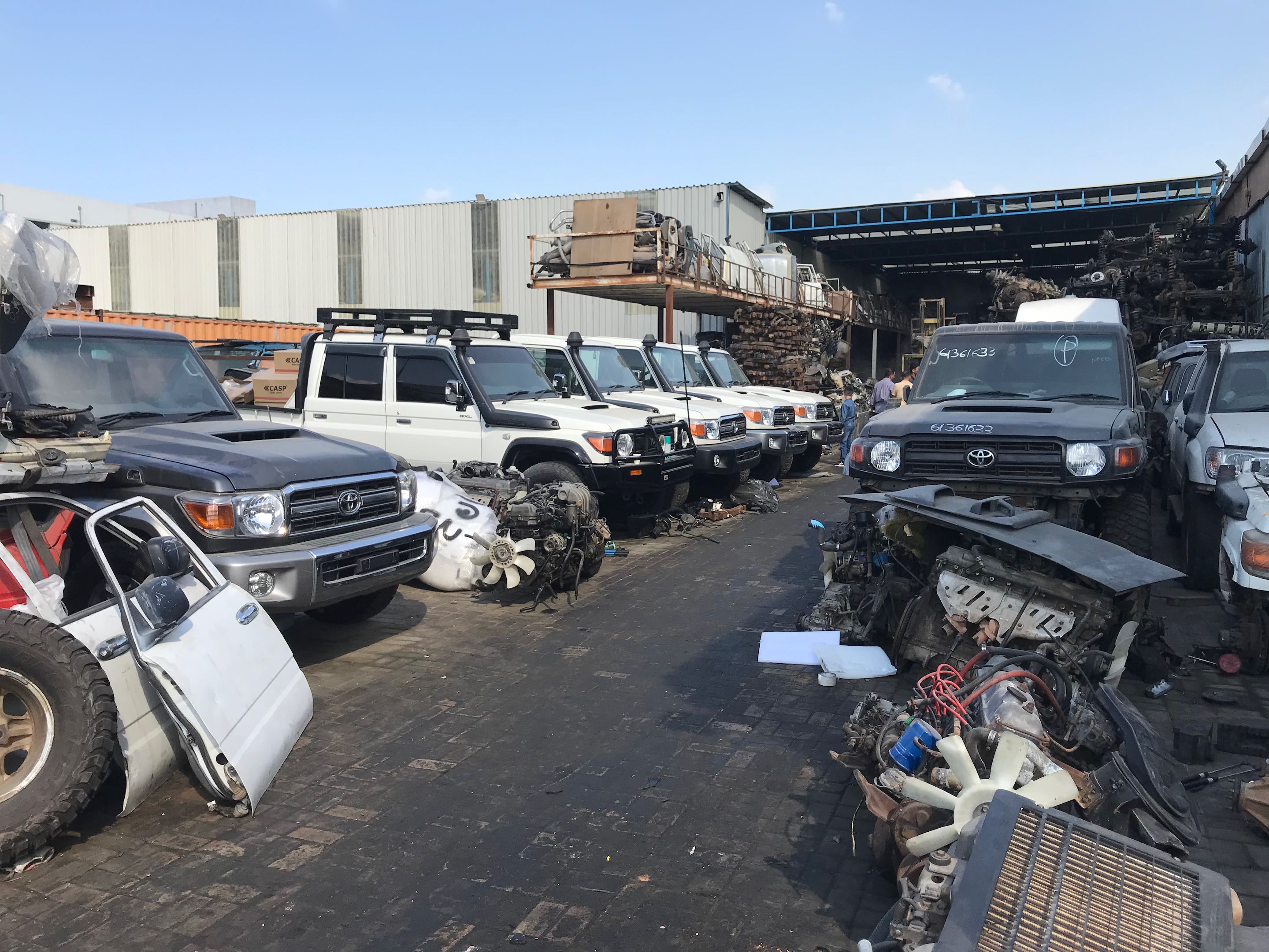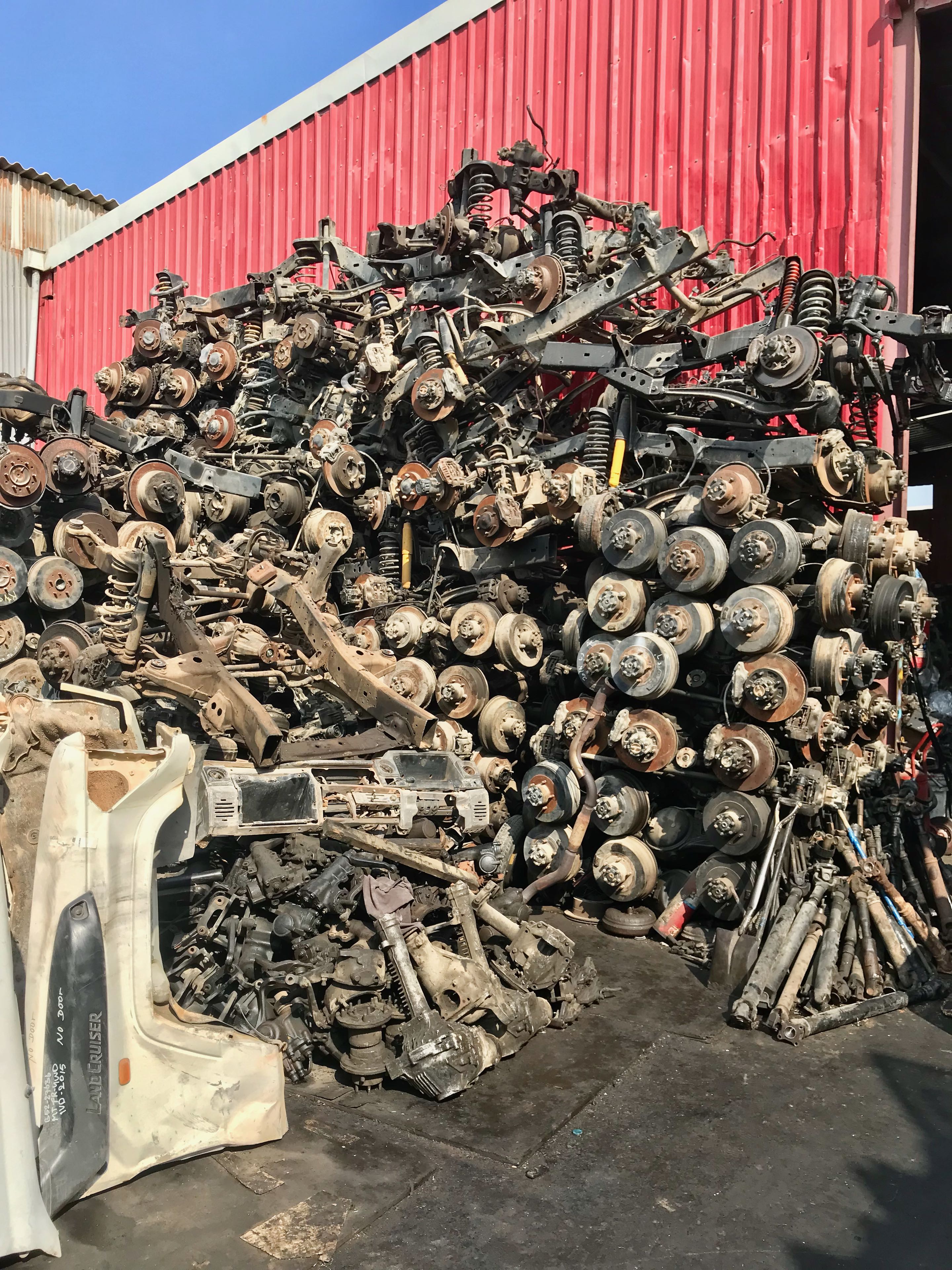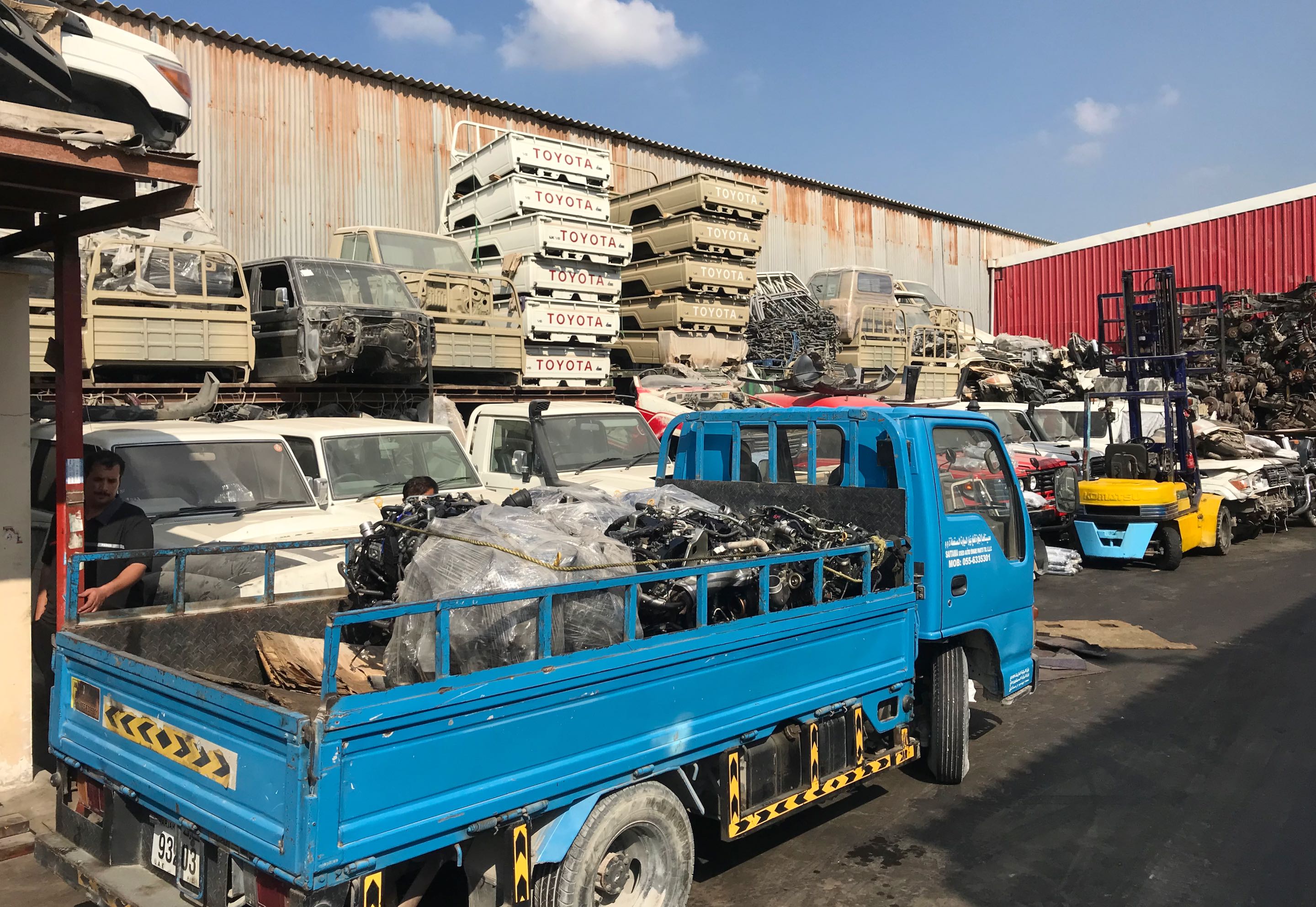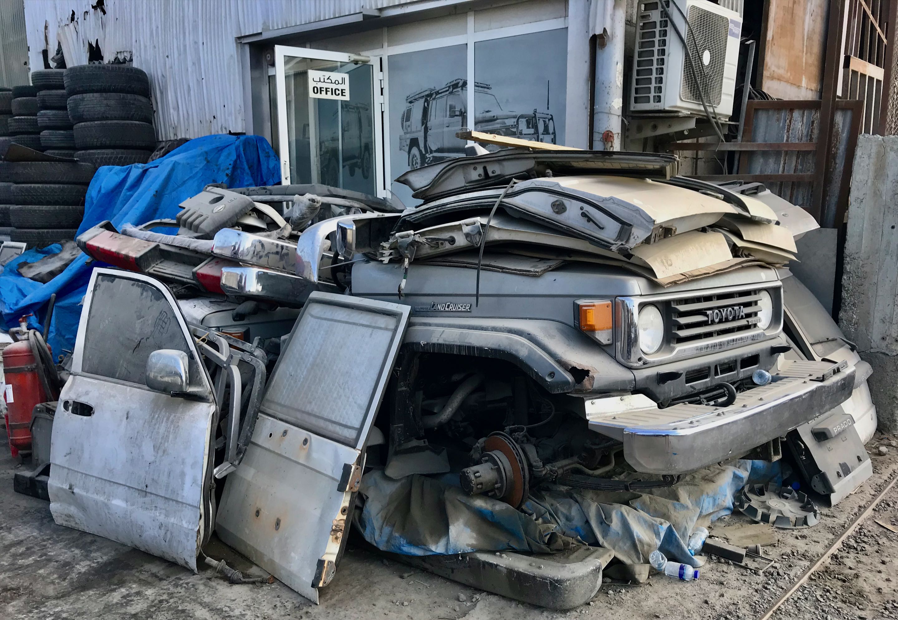 Eerst nog even langs Sharjah industrial area, er zitten daar namelijk wat Toyoto gebruikte onderdelen verkopers. Voor ik die opzoek ga ik eerst nog langs een onderdeel shop waar ze nieuwe onderdelen verkopen, het zijn vanaf de weg te zien kleine filialen. De inrichting bestaat uit een grote balie waar een man of vijf druk zitten te bellen achter hun computerscherm. Verder is er meestal een “cashier” aanwezig in een afgeschermde ruimte. Je bestelt, betaald en krijgt je onderdelen zoiets werkt het. Ik bestel wat nieuwe rubbers voor de stabilisatorstang, fifteen minutes krijg ik te horen… Het blijkt dus gewoon dat iemand dat op de fiets even komt brengen vanuit de hoofdvestiging, ze hebben hier op dit enkele industrieterrein maar liefst 5 vestigingen zie ik later op de plastic zak waar de nieuwe rubbers zich in bevinden. Het zijn dit soort aparte dingen die het reizen leuk maken. Ok met de nieuwe rubbers op zak nu op zoek naar de plek waar ik hopelijk goede gebruikte stabilisatorstangen kan vinden. De huidige zijn op de plek waar de rubbers zitten totaal ingevreten en op het deel wat op de vooras bevestigd zit klappert het nogal. Stabilisatorstangen zorgen inderdaad voor stabiliteit, oftewel het overhellen van de auto als je door de bocht gaat. Ik tref het hier maar er zijn diverse aanbieders met zo’n beetje alles wat je nodig kan hebben voor je landcruiser. Motoren, assen en plaatwerk alles is hier in grote aantallen te vinden.